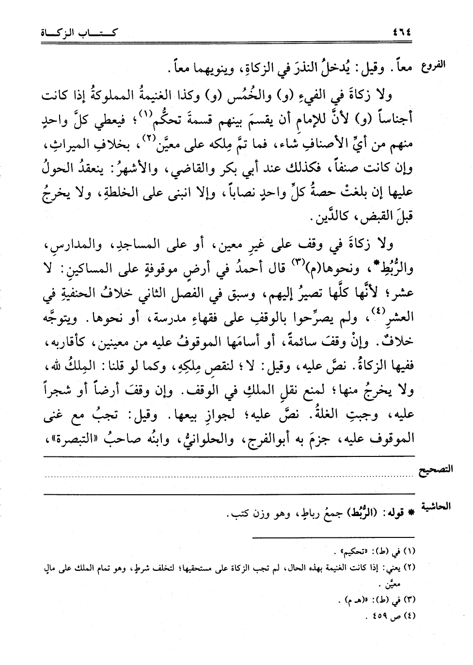 وَلَا زَكَاةَ فِي وَقْفٍ عَلَى غَيْرِ مُعَيَّنٍ أو على المساجد والمدارس والربط ونحوها "م"3 قَالَ أَحْمَدُ فِي أَرْضٍ مَوْقُوفَةٍ عَلَى الْمَسَاكِينِ: لَا عُشْرَ؛ لِأَنَّهَا كُلَّهَا تَصِيرُ إلَيْهِمْ، وَسَبَقَ فِي الْفَصْلِ الثَّانِي خِلَافُ الْحَنَفِيَّةِ فِي الْعُشْرِ4، وَلَمْ يُصَرِّحُوا فِي الْوَقْفِ عَلَى فُقَهَاءِ مَدْرَسَةٍ أَوْ نَحْوِهَا، وَيَتَوَجَّهُ الْخِلَافُ. وَإِنْ وَقَفَ سَائِمَةً أَوْ أَسَامَهَا الْمَوْقُوفُ عَلَيْهِ عَلَى مُعَيَّنِينَ كَأَقَارِبِهِ فَفِيهَا الزَّكَاةُ، نَصَّ عَلَيْهِ، وَقِيلَ: لَا، لِنَقْصِ مِلْكِهِ، وَكَمَا لَوْ قُلْنَا: الْمُلْكُ لِلَّهِ، وَلَا يَخْرُجُ مِنْهَا، لِمَنْعِ نَقْلِ الْمِلْكِ فِي الْوَقْفِ، وَإِنْ وَقَفَ أَرْضًا أَوْ شَجَرًا عَلَيْهِ وَجَبَتْ فِي الْغَلَّةِ، نَصَّ عَلَيْهِ، لِجَوَازِ بَيْعِهَا، وَقِيلَ: تَجِبُ مَعَ غِنَى الْمَوْقُوفِ عَلَيْهِ، جَزَمَ بِهِ أَبُو الْفَرَجِ وَالْحَلْوَانِيُّ وَابْنُهُ صَاحِبُ التَّبْصِرَةِ،