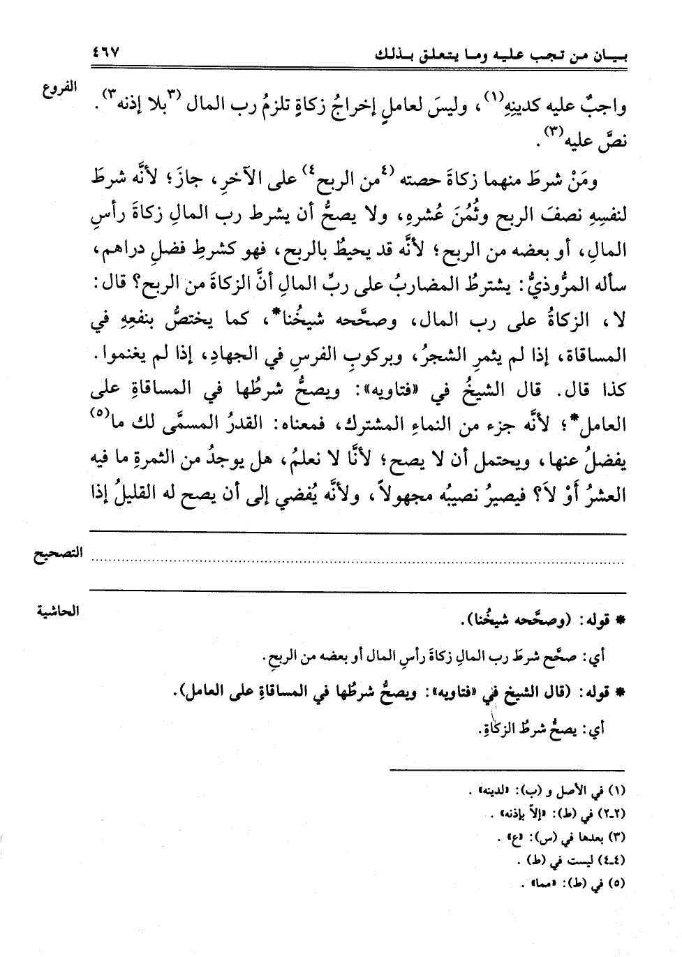 وَمَنْ شَرَطَ مِنْهُمَا زَكَاةَ حِصَّتِهِ 4"من الربح"4 عَلَى الْآخَرِ جَازَ؛ لِأَنَّهُ شَرَطَ لِنَفْسِهِ نِصْفَ الرِّبْحِ وَثَمَنَ عُشْرِهِ، وَلَا يَصِحُّ أَنْ يَشْتَرِطَ رَبُّ الْمَالِ زَكَاةَ رَأْسِ الْمَالِ أَوْ بَعْضِهِ مِنْ الرِّبْحِ؛ لِأَنَّهُ قَدْ يُحِيطُ بِالرِّبْحِ، فَهُوَ كَشَرْطِ فَضْلِ دَرَاهِمَ، سَأَلَهُ الْمَرُّوذِيُّ: يَشْتَرِطُ الْمُضَارِبُ عَلَى رَبِّ الْمَالِ أَنَّ الزَّكَاةَ مِنْ الرِّبْحِ، قَالَ: لَا، الزَّكَاةُ عَلَى رَبِّ الْمَالِ، وَصَحَّحَهُ شَيْخُنَا، كَمَا يَخْتَصُّ بِنَفْعِهِ فِي الْمُسَاقَاةِ إذَا لَمْ يُثْمِرْ الشَّجَرُ، وَرُكُوبِ الْفَرَسِ فِي الْجِهَادِ إذَا لَمْ يَغْنَمُوا، كَذَا قَالَ، قَالَ الشَّيْخُ فِي فَتَاوِيهِ: وَيَصِحُّ شَرْطُهَا فِي الْمُسَاقَاةِ عَلَى الْعَامِلِ؛ لِأَنَّهُ جُزْءٌ مِنْ النَّمَاءِ الْمُشْتَرَكِ، فَمَعْنَاهُ القدر المسمى لك ما5 يَفْضُلُ عَنْهَا، وَيَحْتَمِلُ أَنْ لَا يَصِحَّ؛ لِأَنَّا لَا نَعْلَمُ هَلْ يُوجَدُ مِنْ الثَّمَرَةِ مَا فِيهِ الْعُشْرُ أَوْ لَا؟ فَيَصِيرُ نَصِيبُهُ مَجْهُولًا؛ وَلِأَنَّهُ يُفْضِي إلَى أَنْ يَصِحَّ لَهُ الْقَلِيلُ إذا