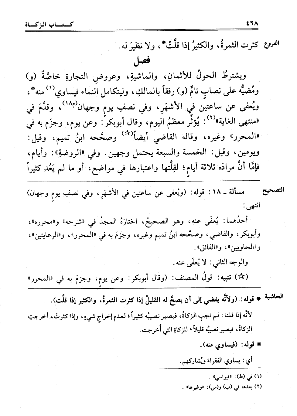 "و" وَمُضِيُّهُ عَلَى نِصَابٍ تَامٍّ "و" رفقا بالمالك، وليتكامل النماء فيساوي1 مِنْهُ، وَيُعْفَى عَنْ سَاعَتَيْنِ فِي الْأَشْهَرِ، وَفِي نِصْفِ يَوْمٍ وَجْهَانِ "م 18" وَقَدَّمَ فِي مُنْتَهَى الْغَايَةِ2: يُؤَثِّرُ مُعْظَمُ الْيَوْمِ. وَقَالَ أَبُو بَكْرٍ: وَعَنْ يَوْمٍ، جَزَمَ بِهِ فِي الْمُحَرَّرِ وَغَيْرِهِ، وَقَالَهُ الْقَاضِي أَيْضًا "*"، وَصَحَّحَهُ ابْنُ تَمِيمٍ، وَقِيلَ: وَيَوْمَيْنِ، وَقِيلَ: الْخَمْسَةُ وَالسَّبْعَةُ يَحْتَمِلُ وَجْهَيْنِ. وَفِي الرَّوْضَةِ: وَأَيَّامٌ، فَإِمَّا أَنَّ مُرَادَهُ ثَلَاثَةُ أَيَّامٍ، لِقِلَّتِهَا وَاعْتِبَارِهَا فِي مَوَاضِعَ، أَوْ مَا لَمْ يعد كثيرا