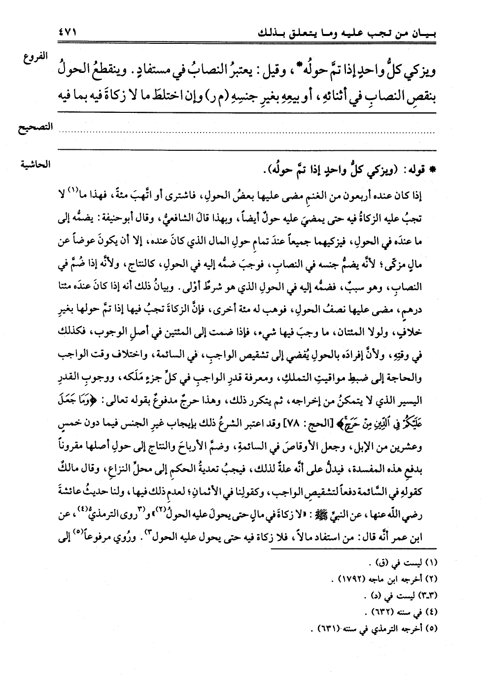 وَيُزَكِّي كُلُّ وَاحِدٍ إذَا تَمَّ حَوْلُهُ، وَقِيلَ: يُعْتَبَرُ النِّصَابُ فِي مُسْتَفَادٍ، وَيَنْقَطِعُ الْحَوْلُ بِنَقْصِ النِّصَابِ فِي أَثْنَائِهِ أَوْ بَيْعهِ بِغَيْرِ جِنْسِهِ "م ر" وَإِنْ اخْتَلَطَ مَا لَا زَكَاةَ فِيهِ بِمَا فِيهِ