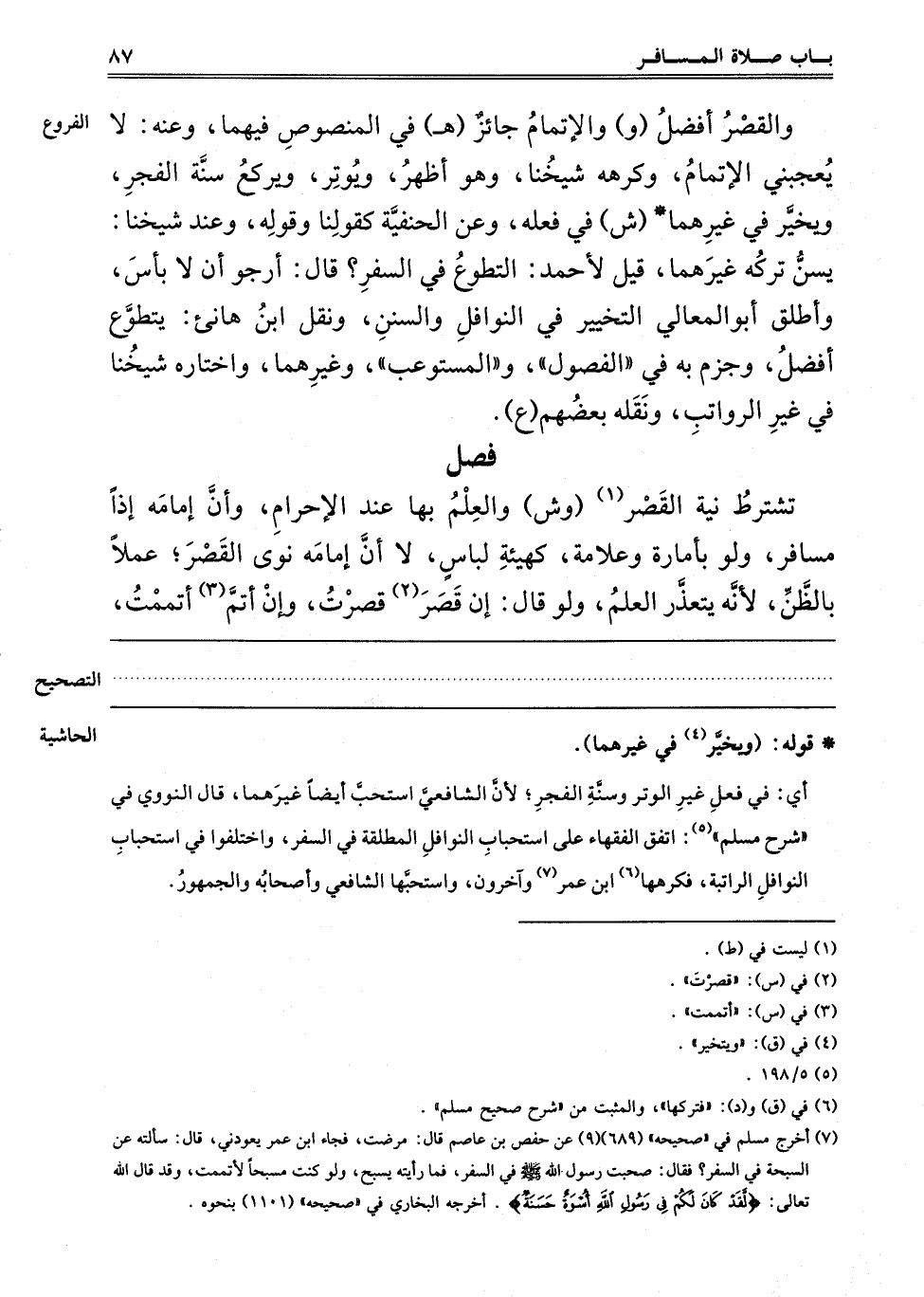 وَالْقَصْرُ أَفْضَلُ "و" وَالْإِتْمَامُ جَائِزٌ "هـ" فِي الْمَنْصُوصِ فِيهِمَا، وَعَنْهُ: لَا يُعْجِبُنِي الْإِتْمَامُ، وَكَرِهَهُ شَيْخُنَا، وَهُوَ أَظْهَرُ، وَيُوتِرُ وَيَرْكَعُ سُنَّةَ الْفَجْرِ، وَيُخَيَّرُ فِي غَيْرِهِمَا "ش" فِي فِعْلِهِ، وَعَنْ الْحَنَفِيَّةِ كَقَوْلِنَا وَقَوْلِهِ، وَعِنْدَ شَيْخِنَا: يُسَنُّ تَرْكُهُ غَيْرَهُمَا، قِيلَ لِأَحْمَدَ: التَّطَوُّعُ فِي السَّفَرِ؟ قَالَ: أَرْجُو أَنْ لَا بَأْسَ، وَأَطْلَقَ أَبُو الْمَعَالِي التَّخْيِيرَ فِي النَّوَافِلِ وَالسُّنَنِ، وَنَقَلَ ابْنُ هَانِئٍ: يَتَطَوَّعُ أَفْضَلُ، وَجَزَمَ بِهِ فِي الْفُصُولِ، وَالْمُسْتَوْعِبِ، وَغَيْرِهِمَا، وَاخْتَارَهُ شَيْخُنَا فِي غَيْرِ الرَّوَاتِبِ، وَنَقَلَهُ بعضهم "ع".