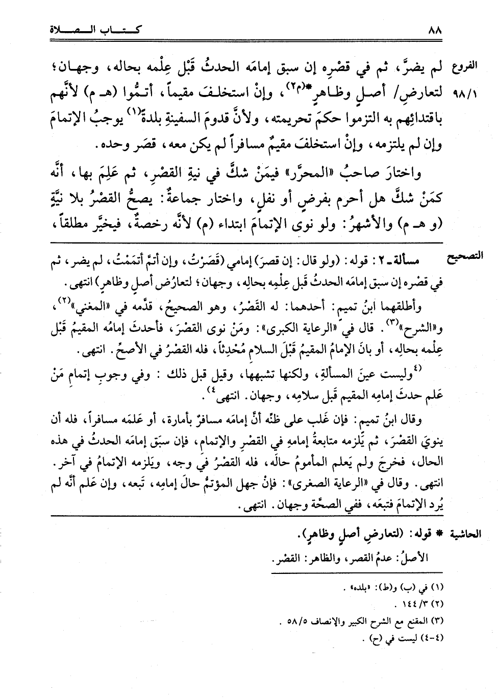 4"وَلَيْسَتْ عَيْنَ الْمَسْأَلَةِ، وَلَكِنَّهَا تُشْبِهُهَا، وَقِيلَ قَبْلَ ذَلِكَ: وَفِي وُجُوبِ إتْمَامِ مَنْ عَلِمَ حَدَثَ إمَامِهِ الْمُقِيمِ قَبْلَ سَلَامِهِ وَجْهَانِ، انْتَهَى"4.