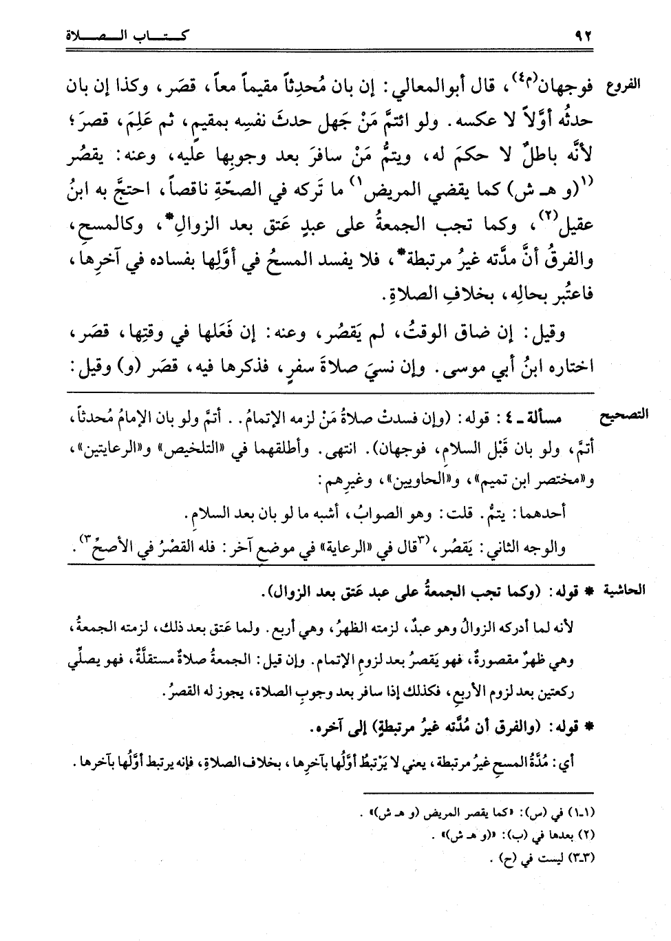 فَوَجْهَانِ "م 4" قَالَ أَبُو الْمَعَالِي: إنْ بَانَ مُحْدِثًا مُقِيمًا مَعًا قَصَرَ، وَكَذَا إنْ بَانَ حَدَثُهُ أَوَّلًا لَا عَكْسُهُ. وَلَوْ ائْتَمَّ مَنْ جَهِلَ حَدَثَ نَفْسِهِ بِمُقِيمٍ ثُمَّ عَلِمَ قَصَرَ؛ لِأَنَّهُ بَاطِلٌ لَا حُكْمَ لَهُ، وَيُتِمُّ مَنْ سافر بعد وجوبها عليه، وعنه: يقصر 1"وهـ ش" كَمَا يَقْضِي الْمَرِيضُ"1 مَا تَرَكَهُ فِي الصِّحَّةِ نَاقِصًا، احْتَجَّ بِهِ ابْنُ عَقِيلٍ2، وَكَمَا تَجِبُ الْجُمُعَةُ عَلَى عَبْدٍ عَتَقَ بَعْدَ الزَّوَالِ، وَكَالْمَسْحِ، وَالْفَرْقُ أَنَّ مُدَّتَهُ غَيْرُ مُرْتَبِطَةٍ، فَلَا يَفْسُدُ الْمَسْحُ فِي أَوَّلِهَا بِفَسَادِهِ فِي آخِرِهَا، فَاعْتُبِرَ بِحَالِهِ، بِخِلَافِ الصَّلَاةِ.