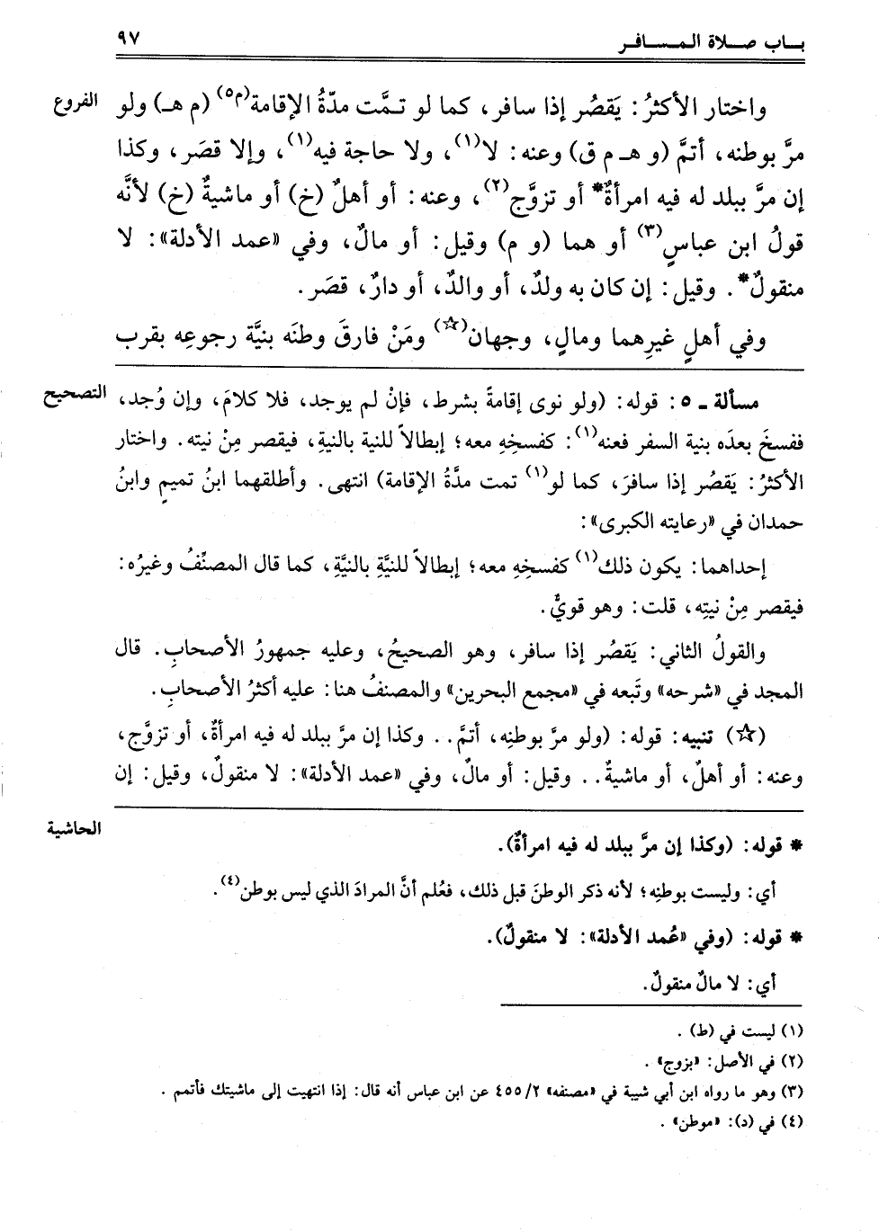 وَاخْتَارَ الْأَكْثَرُ: يَقْصُرُ إذَا سَافَرَ، كَمَا لَوْ تمت مدة الإقامة "م 5" "م هـ ولو مر بوطنه أتم "وهـ م ق" وعنه: لا1، ولا حاجة فيه1، وَإِلَّا قَصَرَ، وَكَذَا إنْ مَرَّ بِبَلَدٍ لَهُ فِيهِ امْرَأَةٌ أَوْ تَزَوَّجَ2، وَعَنْهُ: أَوْ أَهْلٌ "خ" أَوْ مَاشِيَةٌ "خ" لِأَنَّهُ قَوْلُ ابْنِ عباس3 أو هما "وم" وَقِيلَ: أَوْ مَالٌ، وَفِي "عُمَدِ الْأَدِلَّةِ" لَا مَنْقُولٌ وَقِيلَ: إنْ كَانَ بِهِ وَلَدٌ أَوْ وَالِدٌ أَوْ دَارٌ قَصَرَ.
