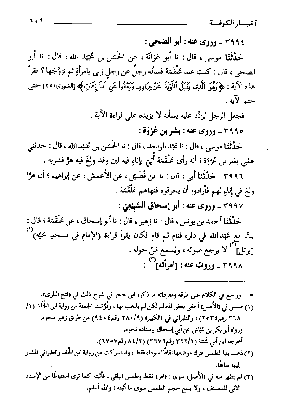 حَدَّثَنَا موسى، قال: حدثنا أَبُو عَوَانَة، عَنِ الحَسَن بْنِ عُبَيْد الله، قال: حدثنا أَبُو الضُّحَى، قَالَ: كُنْتُ عِنْدَ عَلْقَمَة فَسَأَلَهُ رجلٌ عَنْ رجلٍ زَنَى بامرأةٍ ثُمَّ تزوَّجَها؟ فَقَرَأَ هَذِهِ الآيَةَ: {وَهُوَ الَّذِي يَقْبَلُ التَّوْبَةَ عَنْ عِبَادِهِ وَيَعْفُو عَنِ السَّيِّئَاتِ} الشورى/٢٥ حَتَّى خَتَمَ الآيَةَ.