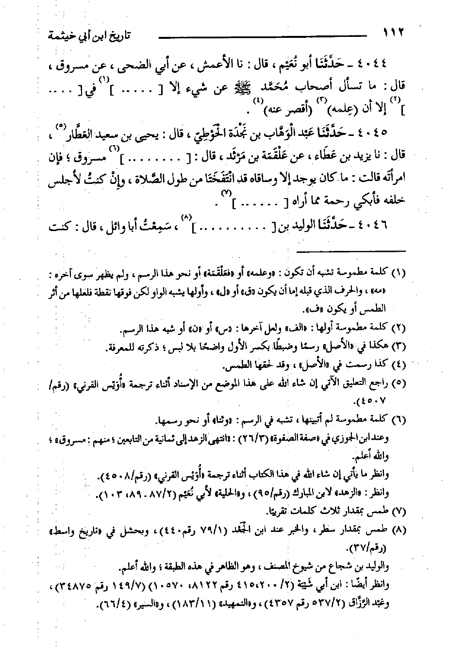 ٤٠٤٥- حَدَّثَنَا عَبْد الْوَهَّاب بْنُ نَجْدَة الْحَوْطِيّ، قَالَ: يَحْيَى بْن سَعِيد العَطَّار، قال: حدثنا يَزِيدُ بْنُ عَطَاء، عَنْ عَلْقَمَة بْن مَرْثَد، قَالَ: ... مسروق؛ فإن امرأتَه قالت: ما كَانَ يوجد إلا وساقاه قَدِ انْتَفَخَتَا من طول الصَّلاة، وإِنْ كنتُ لأجلس خلفه فأبكي رحمة مِمَّا أراه ... .