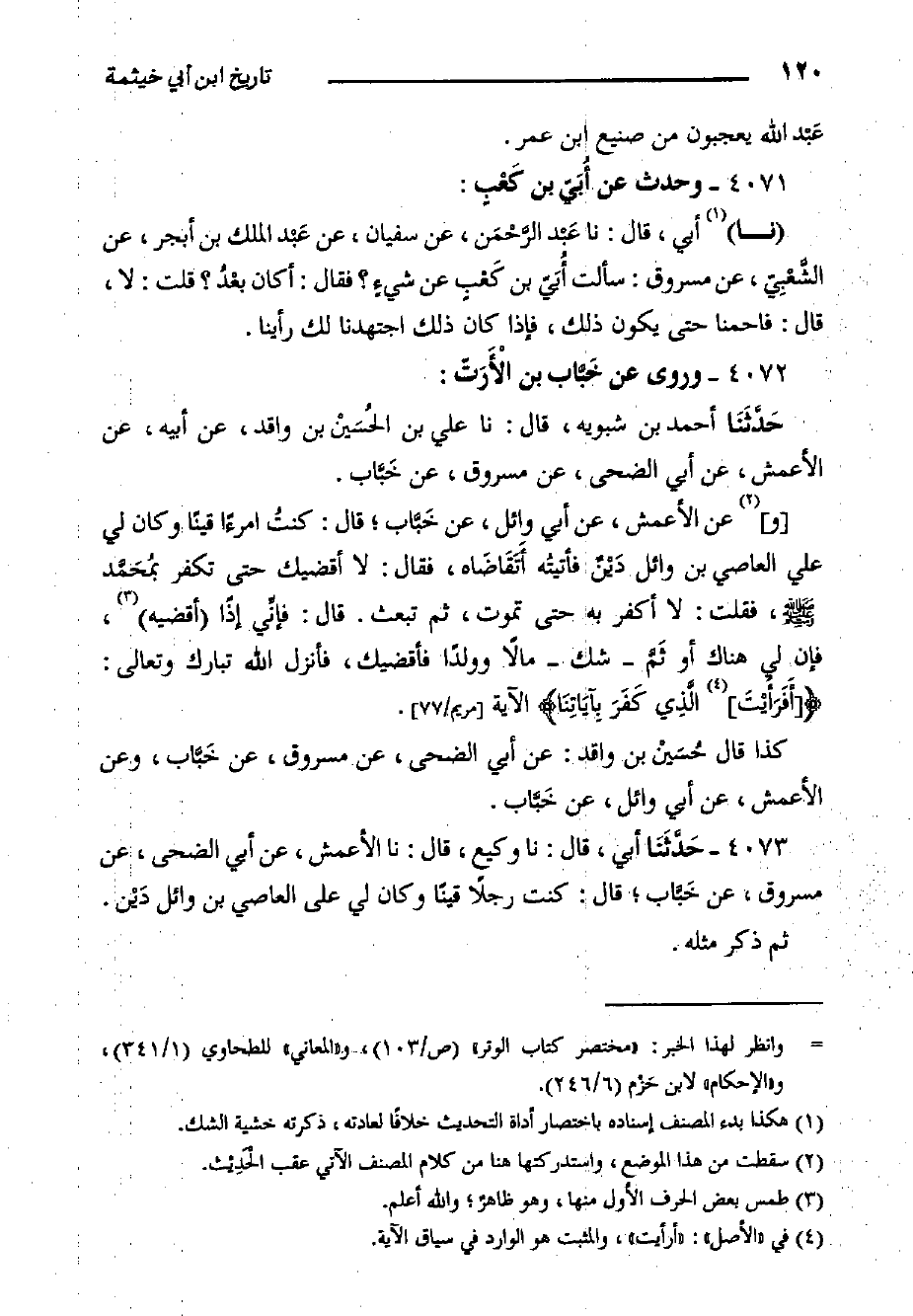 ٤٠٧٣- حَدَّثَنَا أبي، قال: حدثنا وكيع، قال: حدثنا الأَعْمَشُ، عَنْ أَبِي الضُّحَى، عَنْ مَسْرُوقٍ، عَنْ خَبَّاب؛ قَالَ: كُنْتُ رَجُلا قَيْنًا وَكَانَ لِي عَلَى الْعَاصِي بْنِ وَائِلٍ دَيْن، ثُمَّ ذَكَرَ مِثْلَهُ