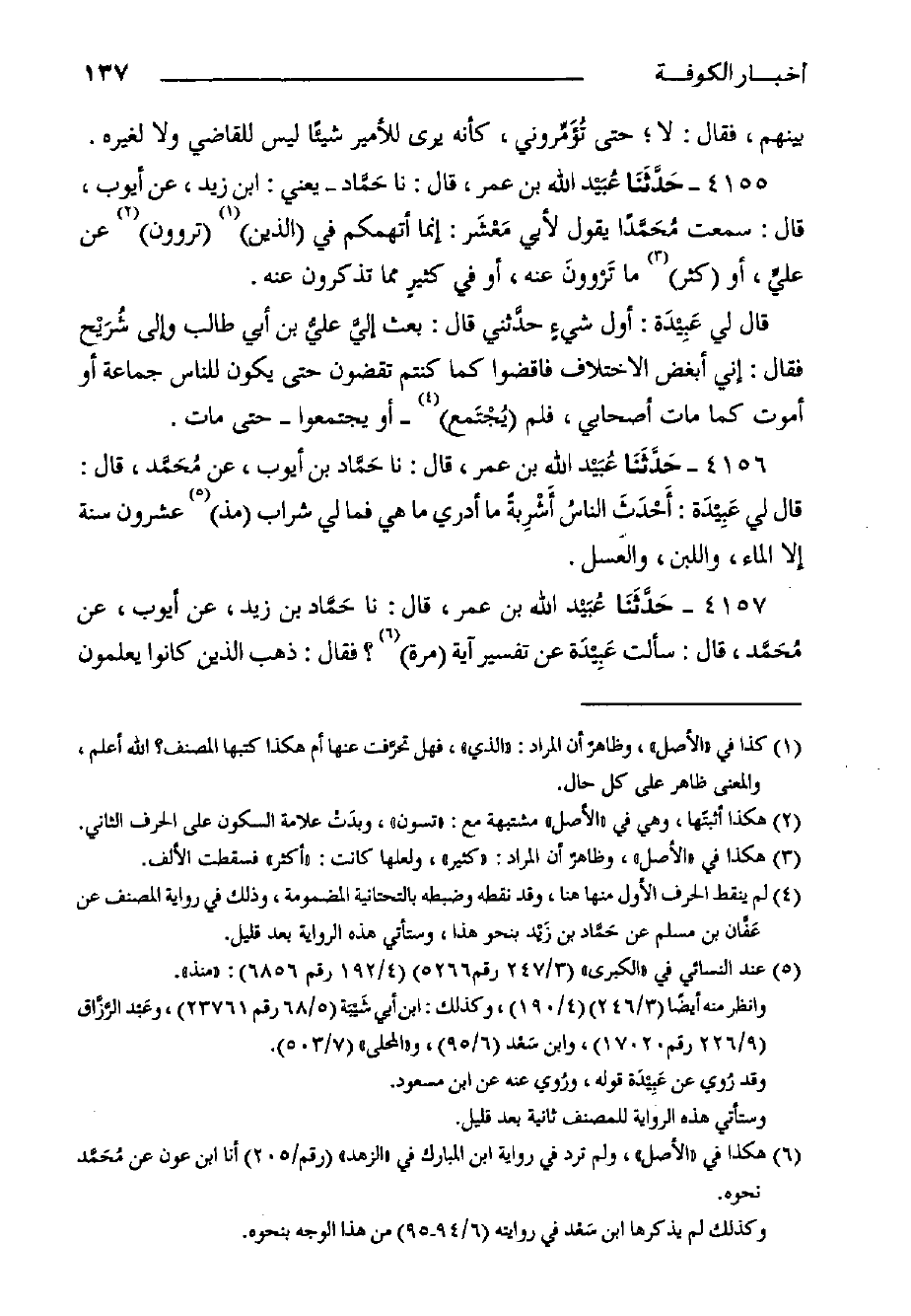 ٤١٥٦- حَدَّثَنَا عُبَيْد الله بن عمر، قال: حدثنا حَمَّاد بْنُ أَيُّوبَ، عَنْ مُحَمَّد، قَالَ: قَالَ لي عَبِيْدَة: أَحْدَثَ الناسُ أَشْرِبةً ما أدري ما هِيَ فما لي شراب مذ عشرون سنة إلا الماء، واللبن، والعسل.
