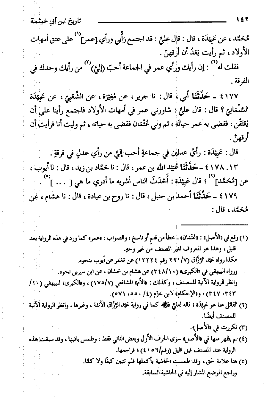 ٤١٧٧- حَدَّثَنَا أَبِي، قَالَ: حَدَّثَنَا جَرِيرٌ، عَنْ مُغِيْرَة، عَنِ الشَّعْبِيّ، عَنْ عَبِيْدَة السَّلْمَانِيّ؟ قَالَ: قَالَ عليٌّ: شَاوَرَنِي عُمَرُ فِي أُمَّهَاتِ الأَوْلادِ فَاجْتَمَعَ رَأْيُنَا عَلَى أَنْ يُعْتَقْن، فَقَضَى بِهِ عُمَرُ حياتَه، ثُمَّ وَلِيَ عُثْمَان فَقَضَى بِهِ حَيَاتَهُ، ثُمَّ وَلِيتُ أَنَا فَرَأَيْتُ أَنْ أرقهنَّ.