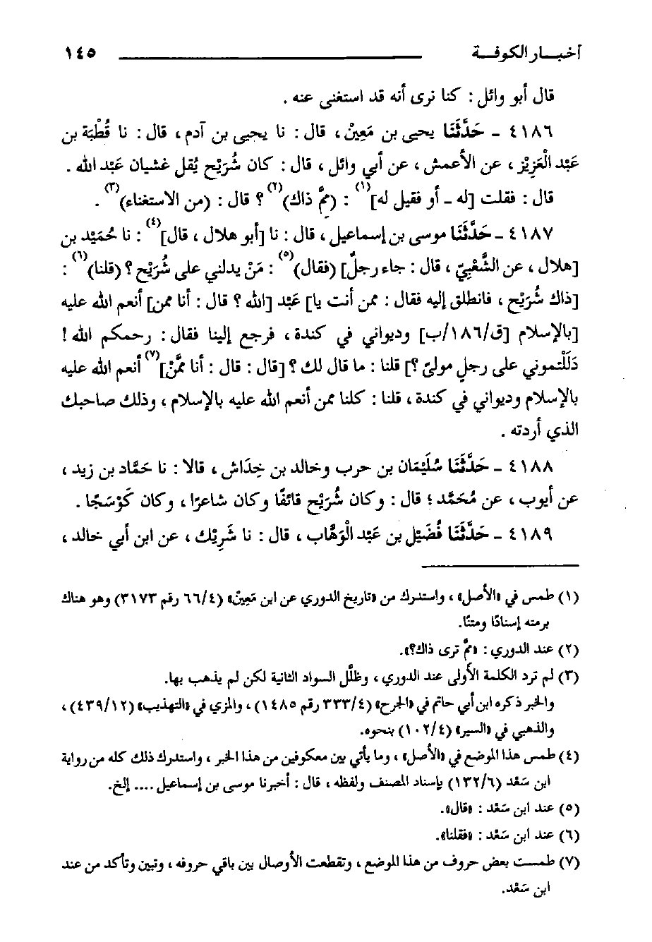 ٤١٨٦- حَدَّثَنَا يَحْيَى بن مَعِيْن، قال: حدثنا يحيى بن آدم، قال: حدثنا قُطْبَة بْنُ عَبْد الْعَزِيْز، عَنِ الأَعْمَشِ، عَنْ أَبِي وَائِلٍ، قَالَ: كَانَ شُرَيْح يُقل غَشَيَانَ عَبْد اللَّهِ.