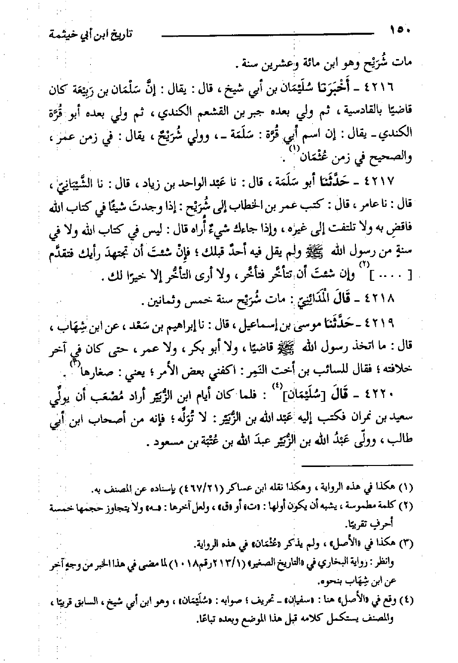 ٤٢١٦- أَخْبَرَنَا سُلَيْمَان بْن أَبِي شيخ، قَالَ: يُقَالُ: إنَّ سَلْمَان بْن رَبِيْعَة كَانَ قاضيا بالقادسية، ثُمَّ ولي بعده جبر بْن القشعم الكندي، ثُمَّ ولي بعده أَبُو قُرَّة الكندي - يُقَالُ: إن اسم أَبِي قُرَّة: سَلَمَة، وولي شُرَيْحٌ، يُقَالُ: فِي زمن عُمَر، والصحيح فِي زمن عُثْمَان.