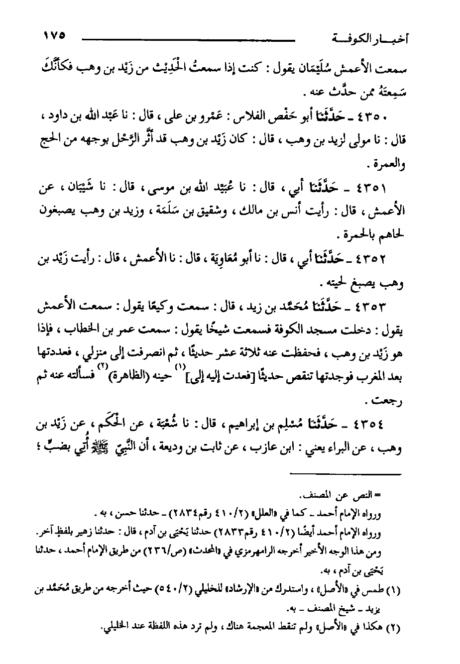 ٤٣٥٣- حَدَّثَنا مُحَمَّد بْنُ زَيْدٍ، قَالَ: سَمِعْتُ وَكِيعًا يَقُولُ: سَمِعْتُ الأَعْمَشَ يَقُولُ: دَخَلْتُ مَسْجِدَ الْكُوفَةِ فَسَمِعْتُ شَيْخًا يَقُولُ: سَمِعْتُ عُمَرَ بْنَ الْخَطَّابِ، فَإِذَا هُوَ زَيْد بْنُ وَهْبٍ، فَحَفِظْتُ عَنْهُ ثَلاثَةَ عَشَرَ حَدِيثًا، ثُمَّ انْصَرَفْتُ إِلَى مَنْزِلِي، فَعَدَدْتُهَا بَعْدَ الْمَغْرِبِ فَوَجَدْتُهَا تَنْقُصُ حَدِيثًا فعِدت إِلَيْهِ إِلَى حِينِهِ الظَّاهِرَةَ فَسَأَلْتُهُ عَنْهُ ثُمَّ رَجَعْتُ.