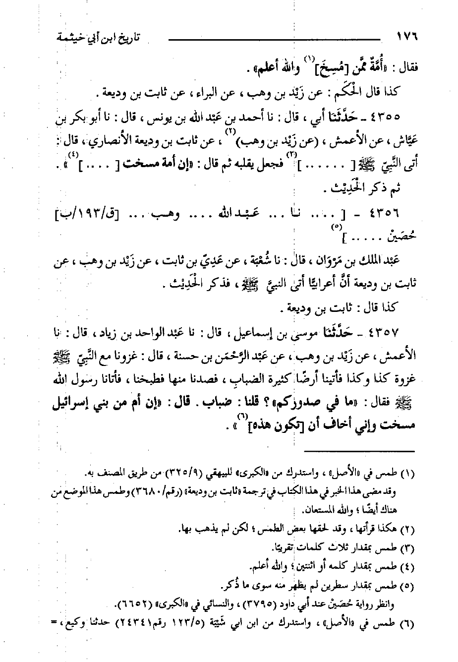 ٤٣٥٧- حَدَّثَنا مُوسَى بن إسماعيل، قال: حَدَّثَنَا عَبْد الْوَاحِدِ بْنُ زِيَادٍ، قال: حدثنا الأَعْمَشُ، عَنْ زَيْد بْنِ وَهْبٍ، عَنْ عَبْد الرَّحْمَن بْنِ حَسَنَةَ، قَالَ: غَزَوْنَا مَعَ النَّبِيّ صَلَّى اللَّهُ عَلَيْهِ وَسَلَّمَ غَزْوَةَ كَذَا وَكَذَا فَأَتَيْنَا أَرْضًا كَثِيرَةَ الضبابِ، فَصِدْنَا مِنْهَا فَطَبَخْنَا، فَأَتَانَا رَسُولُ اللَّهِ صَلَّى اللَّهُ عَلَيْهِ وَسَلَّمَ فَقَالَ: مَا فِي صُدُورِكُمْ"؟ قُلْنَا: ضباب. قال: إن أم مِنْ بَنِي إِسْرَائِيلَ مُسِخَتْ وَإِنِّي أَخَافُ أَنْ تَكُونَ هَذِهِ