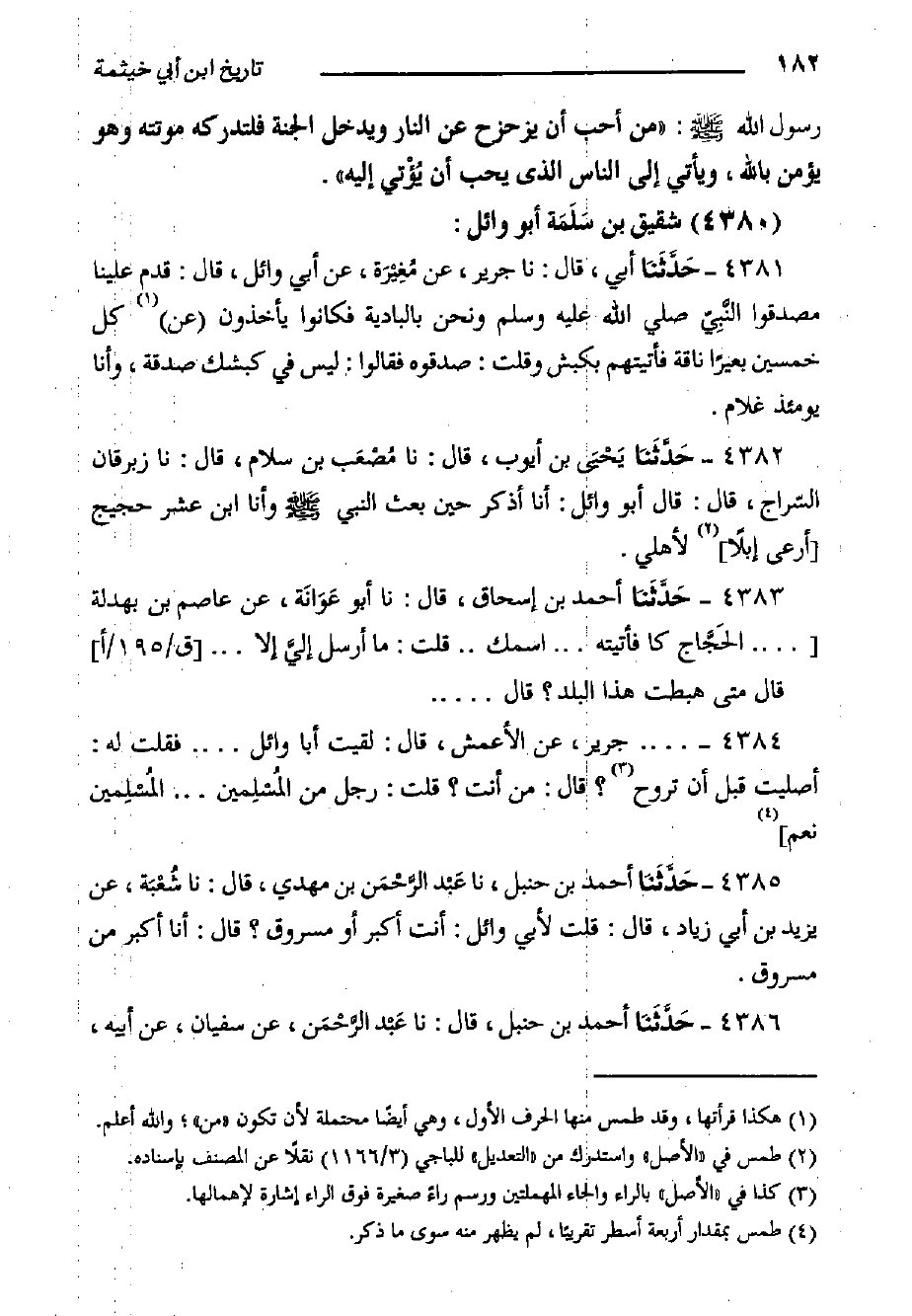 ٤٣٨٤ـ ... جَرِير، عَنِ الأَعْمَشِ، قَالَ: لقيت أبا وَائِل ... فقلت لَهُ: أصليت قبل أن تروح؟ قَالَ: من أنت؟ قلت: رَجُل من المُسْلِمين ... المُسْلِمين نعم