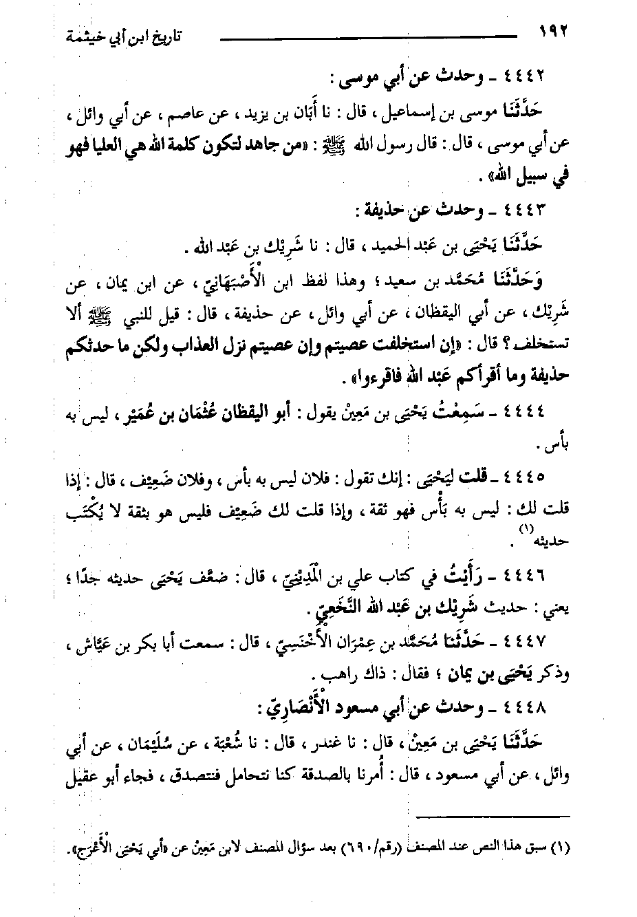 ٤٤٤٥- قلت ليَحْيَى: إنك تقول: فلان ليس به بأس، وفلان ضَعِيْف، قَالَ: إذا قلت لك: ليس به بَأْس فهو ثقة، وإذا قلت لك ضَعِيْف فليس هو بثقة لا يُكْتَب حديثه.