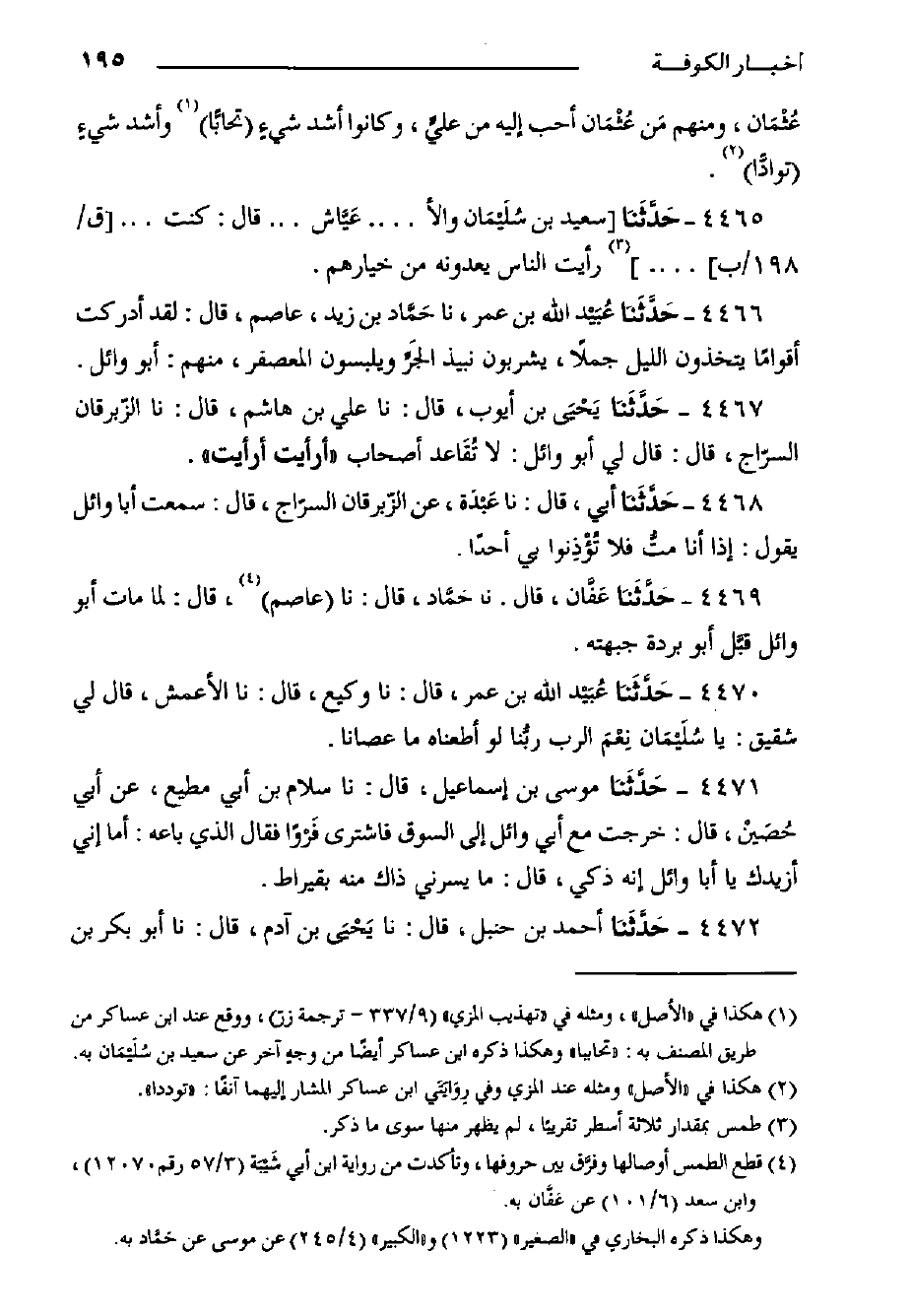 ٤٤٦٧- حَدَّثَنا يَحْيَى بن أيوب، قال: حدثنا علي بن هاشم، قال: حدثنا الزِّبْرِقَانُ السَّرَّاجُ، قَالَ: قَالَ لِي أَبُو وَائِل: لا تُقَاعد أصحاب "أرأيت أرأيت.