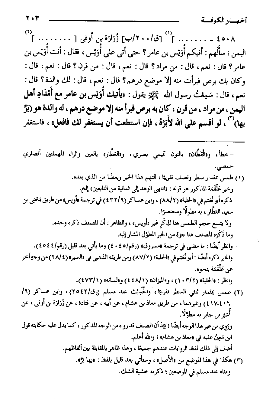 ٤٥٠٨- ... . [ق/٢٠٠/ب] زُرَارَة بْن أوفى ... اليمن؛ سأَلَهم: أفيكم أُوَيْس بْن عامر؟ حَتَّى أتى على أُوَيْس، فَقَالَ: أنت أُوَيْس بْن عامر؟ قَالَ: نعم، قَالَ: من مراد؟ قَالَ: نعم، قَالَ: من قرن؟ قَالَ: نعم، قَالَ: وَكَانَ بك برص فبرأت مِنْهُ إلا موضع درهم؟ قَالَ: نعم، قَالَ: لك والدة؟ قَالَ: نعم، قَالَ: سَمِعْتُ رَسُولَ اللَّهِ صَلَّى اللَّهُ عَلَيْهِ وَسَلَّمَ يَقُولُ: "يأتيك أُوَيْس بْن عامر مع أَمْدَادِ أهل اليمن، من مراد، من قرن، كَانَ به برص فبرأ مِنْهُ إلا موضع درهم، لَهُ والدة هو بَرٌّ بها، لَوْ أَقْسَمَ عَلَى اللَّهِ لأَبَرَّهُ، فإن استطعت أن يستغفر لك فافعل"، فاستغف