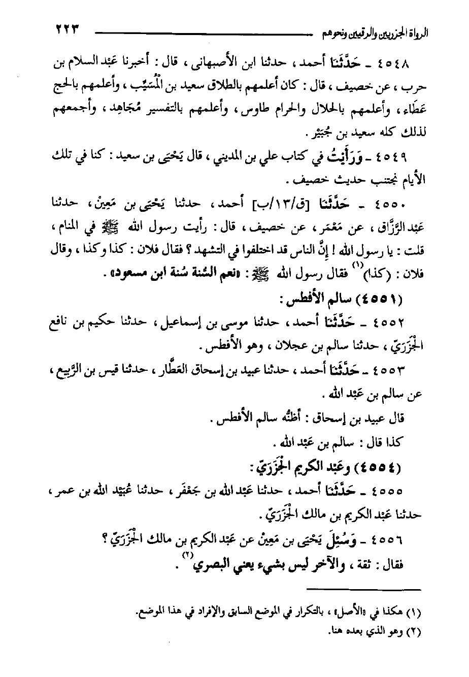 ٤٥٥٥- حَدَّثَنا أَحْمَدُ، حَدَّثَنَا عَبْد اللَّهِ بْنُ جَعْفَر، حَدَّثَنَا عُبَيْد اللَّهِ بْنُ عمر، حَدَّثَنَا عَبْد الْكَرِيمِ بْن مالك الْجَزَرَيّ.