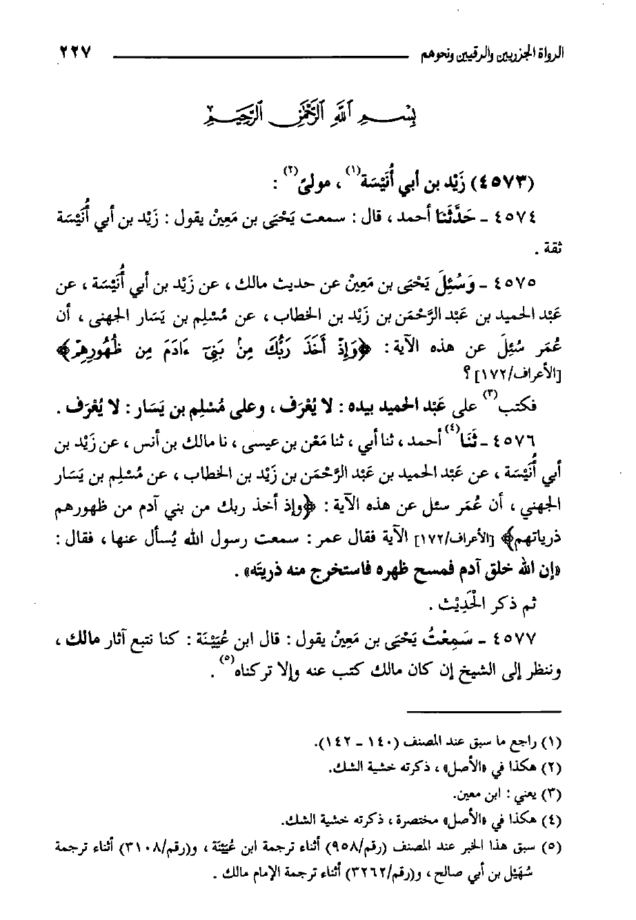 ٤٥٧٥- وَسُئِلَ يَحْيَى بْن مَعِيْن عن حديث مالك، عن زَيْد بْن أبي أُنَيْسَة، عَنْ عَبْد الحميد بن عَبْد الرَّحْمَن بْنِ زَيْد بْنِ الْخَطَّابِ، عَنْ مُسْلِم بن يَسَار الجهني، أن عُمَر سُئِلَ عن هذه الآية: {وَإِذْ أَخَذَ رَبُّكَ مِنْ بَنِي آدَمَ مِنْ ظُهُورِهِمْ} الأعراف/١٧٢؟ فكتب على عَبْد الحميد بيده: لا يُعْرَف، وعلى مُسْلِم بْن يَسَار: لا يُعْرَف.