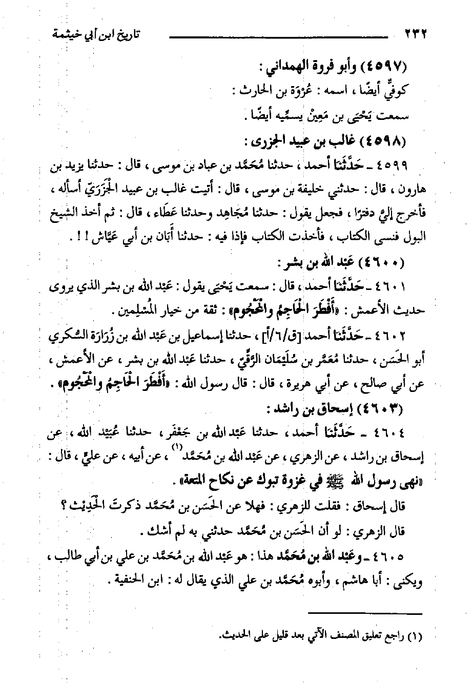 ٤٦٠٤- حَدَّثَنا أَحْمَدُ، حَدَّثَنَا عَبْد اللَّهِ بْنُ جَعْفَر، حَدَّثَنَا عُبَيْد اللَّهِ، عَنِ إِسْحَاقَ بْنِ رَاشِدٍ، عَنِ الزُّهْرِيِّ، عَنْ عَبْد اللَّهِ بْنِ مُحَمَّد، عَنْ أَبِيهِ، عَنْ عليٍّ، قَالَ: نَهَى رَسُولَ اللَّهِ صَلَّى اللَّهُ عَلَيْهِ وَسَلَّمَ فِي غَزْوَةِ تَبُوكَ عَنْ نِكَاحِ الْمُتْعَةِ.