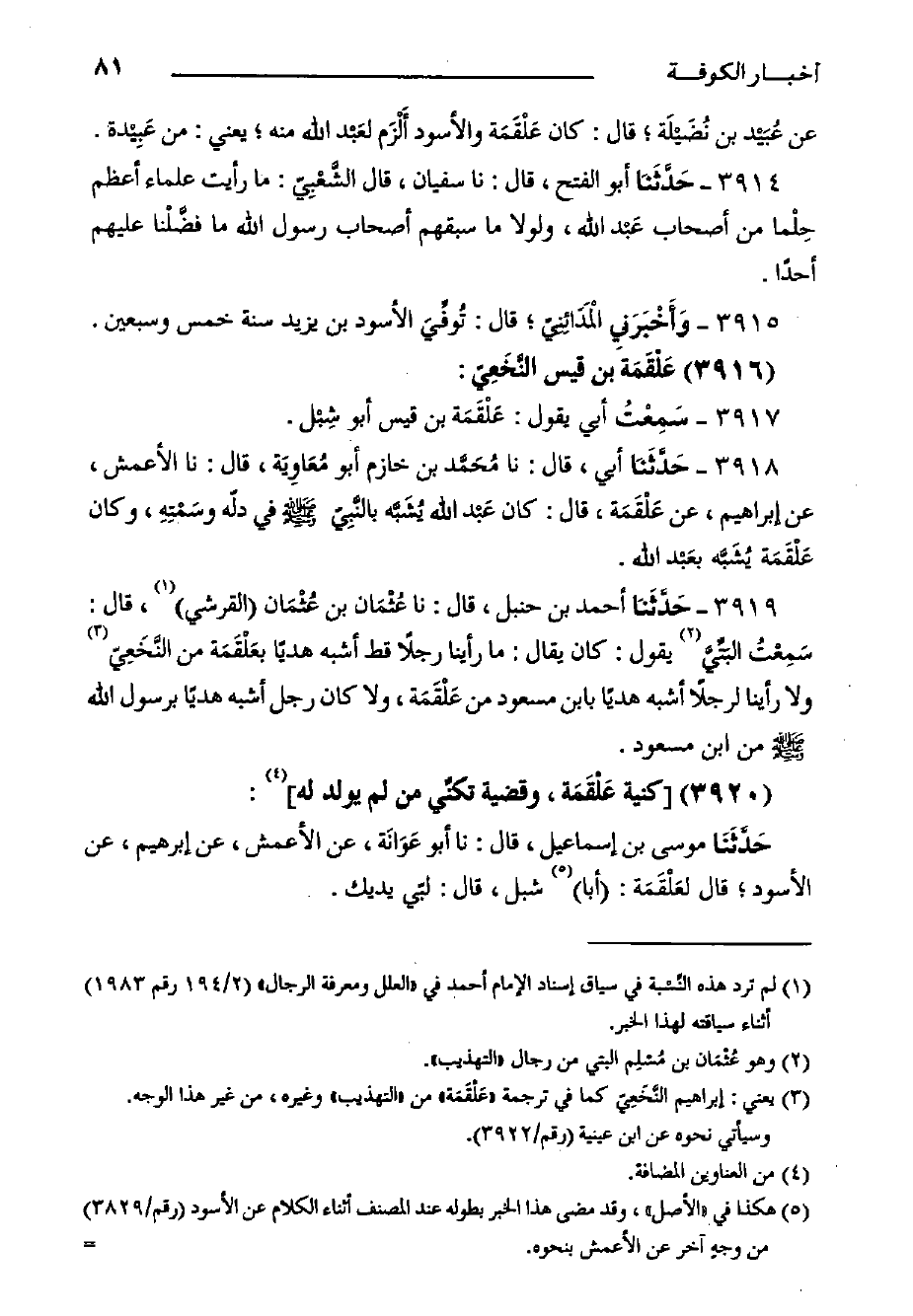 ٣٩١٩- حَدَّثَنا أَحْمَدُ بن حنبل، قال: حدثنا عُثْمَان بْن عُثْمَان الْقُرَشِيّ، قَالَ: سَمِعْتُ البَتِّيَّ يقول: كَانَ يُقَالُ: ما رأينا رجلا قط أشبه هديا بعَلْقَمَة من النَّخَعِيّ (٣- ولا رأينا لرجلا أشبه هديا بابن مَسْعُود من عَلْقَمَة، ولا كَانَ رَجُل أشبه هديا برَسُول اللَّهِ صَلَّى اللَّهُ عَلَيْهِ وَسَلَّمَ من ابن مَسْعُود.