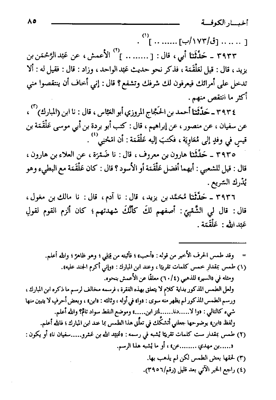 ٣٩٣٤- حَدَّثَنا أَحْمَدُ بْنُ الحَجَّاج الْمَرْوَزِيُّ أَبُو العَبَّاس، قال: حدثنا ابْنُ الْمُبَارَكِ، عَنْ سُفْيَانَ، عَنْ مَنْصُورٍ، عَنْ إِبْرَاهِيمَ، قَالَ: كَتَبَ أَبُو بردة بْن أَبِي مُوسَى عَلْقَمَة بْنَ قيسٍ فِي وفدٍ إِلَى مُعَاوِيَة، فكتبَ إِلَيْهِ عَلْقَمَة: أَنِ امْحُنِي.