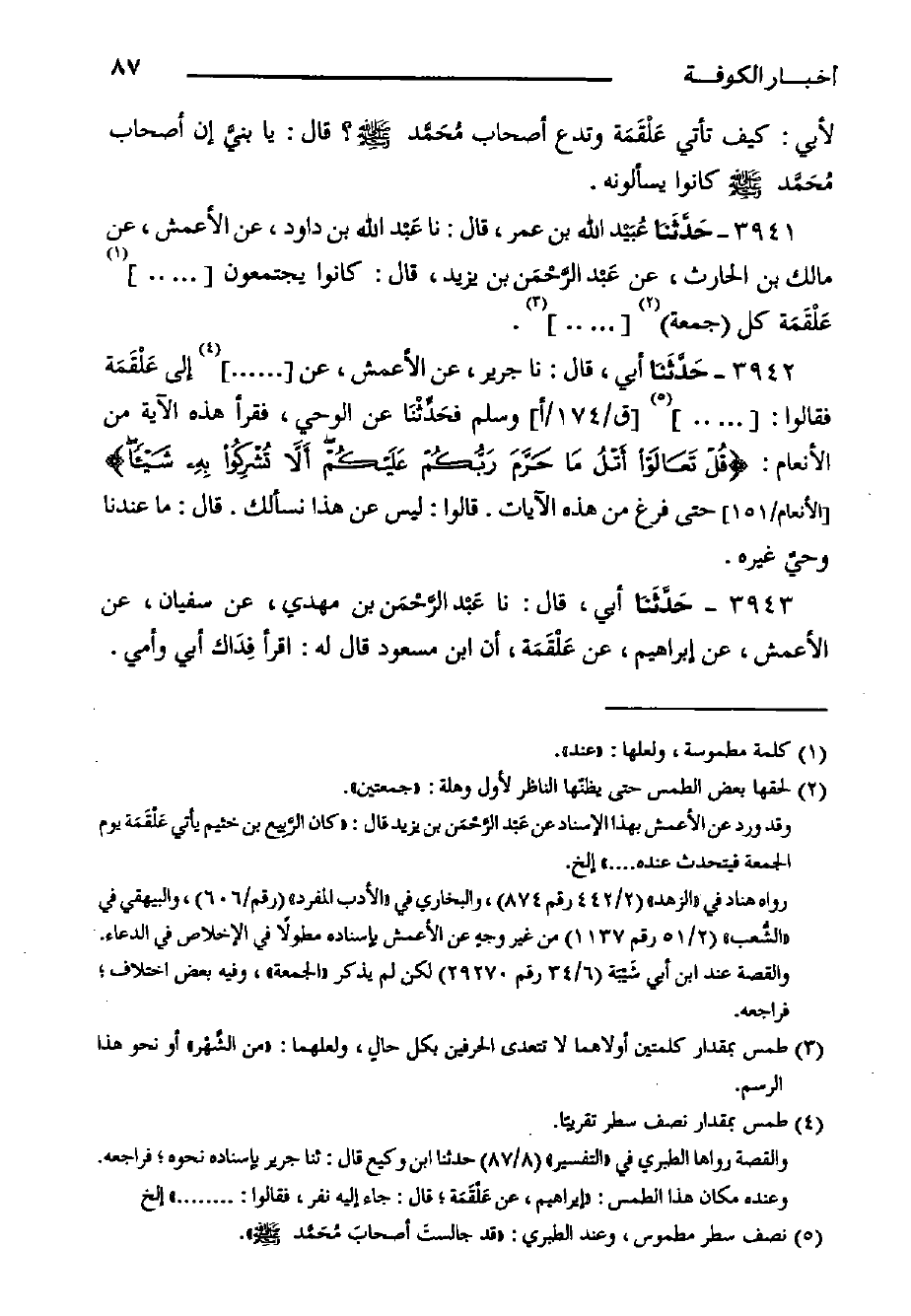 ٣٩٤١- حَدَّثَنا عُبَيْد الله بن عمر، قَالَ: حَدَّثَنَا عَبْد اللَّهِ بْنُ دَاوُدَ، عَنِ الأَعْمَشِ، عَنْ مَالِكِ بْنِ الْحَارِثِ، عَنْ عَبْد الرَّحْمَن بْنِ يَزِيدَ، قَالَ: كَانُوا يَجْتَمِعُونَ ... عَلْقَمَة كُلَّ جُمُعَةٍ ... .