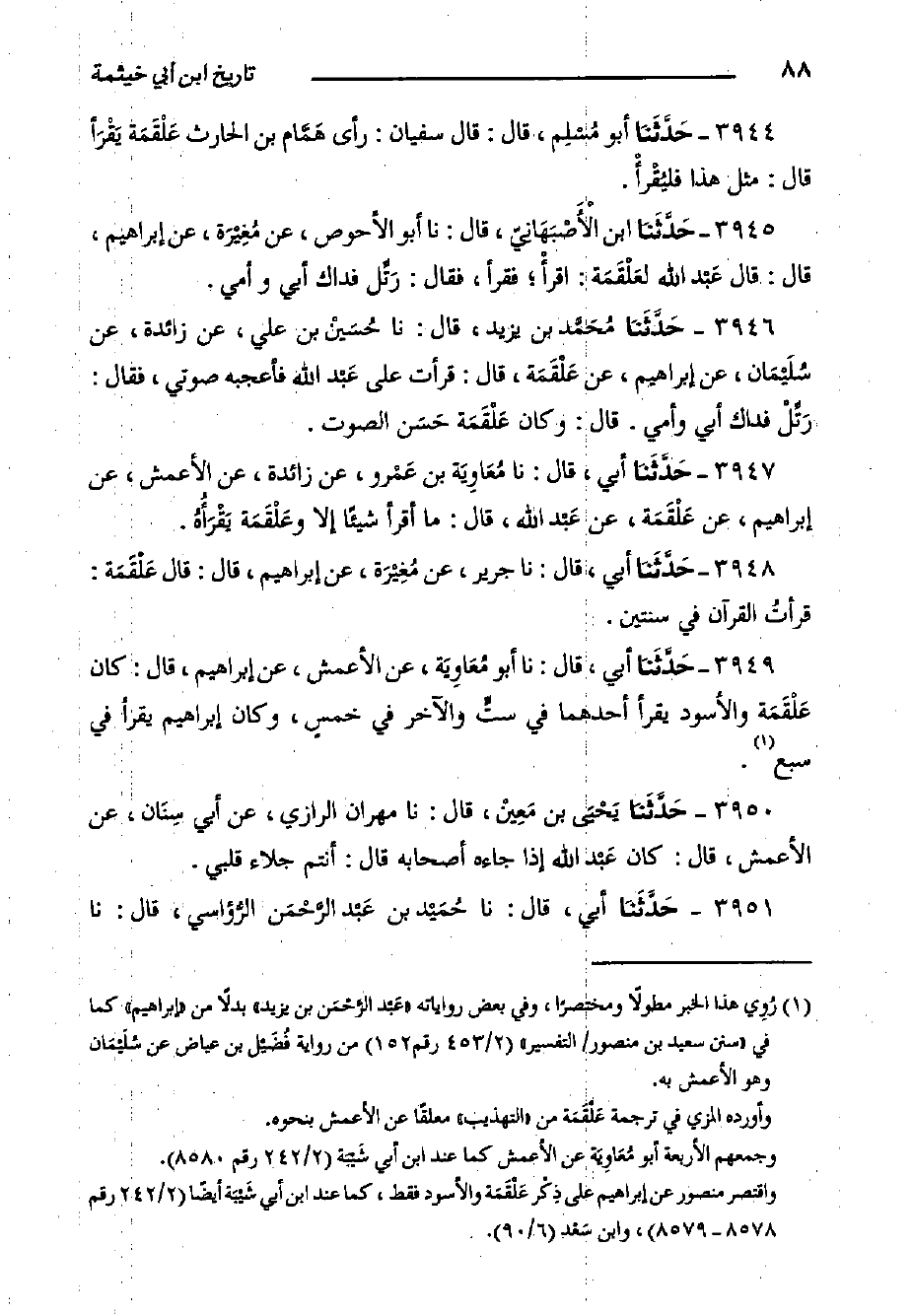 ٣٩٤٩- حَدَّثَنا أبي، قال: حدثنا أَبُو مُعَاوِيَة، عَنِ الأَعْمَشِ، عَنِ إِبْرَاهِيمَ، قَالَ: كَانَ عَلْقَمَة وَالأَسْوَدُ يَقْرَأُ أَحَدُهُمَا فِي ستٍّ وَالآخَرُ فِي خمسٍ، وَكَانَ إِبْرَاهِيمُ يَقْرَأُ فِي سَبْعٍ.