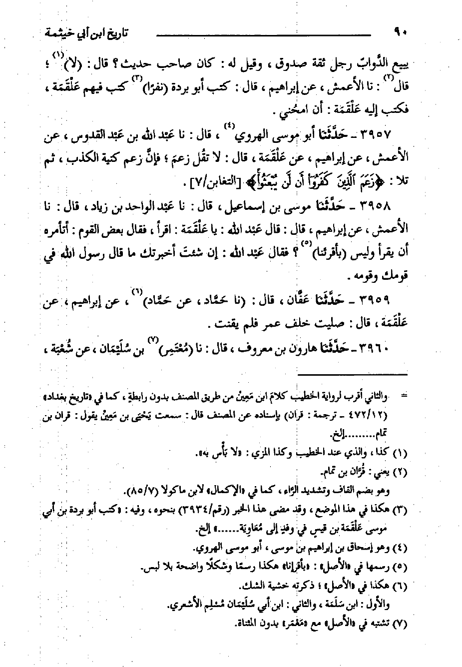 ٣٩٥٧- حَدَّثَنا أَبُو مُوسَى الْهَرَوِيُّ قَالَ: حَدَّثَنَا عَبْد اللَّهِ بْنُ عَبْد الْقُدُّوسِ، عَنِ الأَعْمَشِ، عَنْ إِبْرَاهِيمَ، عَنْ عَلْقَمَة، قَالَ: لا تقُل زعمَ؛ فإنَّ زَعَمَ كُنْيَةُ الْكَذِبِ، ثُمَّ تَلا: {زَعَم الَّذِين كَفَرُوا أَنْ لَنْ يُبْعَثُوا} التغابن/٧.