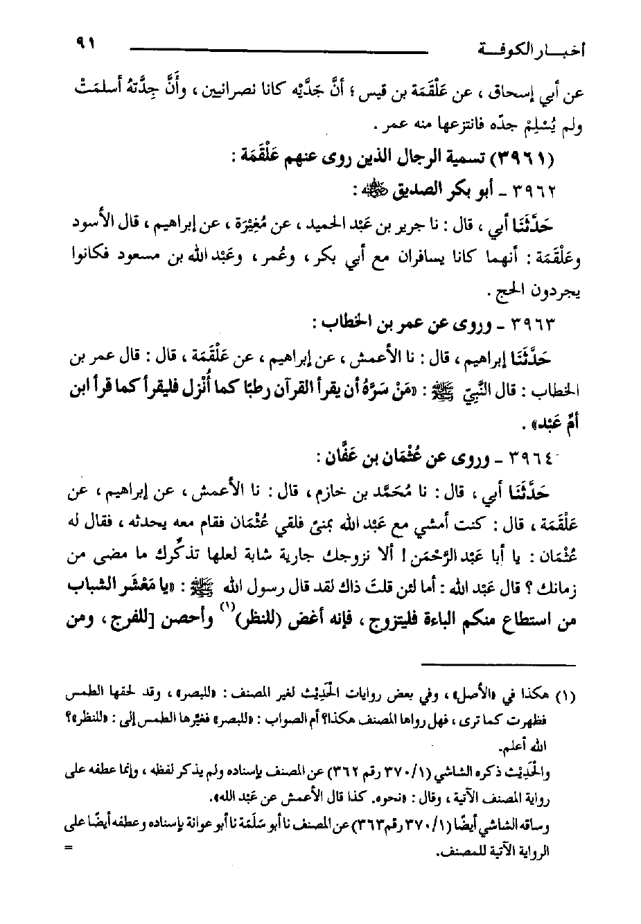 حَدَّثَنَا أَبِي، قَالَ: حَدَّثَنَا مُحَمَّد بن خازم، قال: حدثنا الأَعْمَشِ، عَنْ إِبْرَاهِيمَ، عَنْ عَلْقَمَة، قَالَ: كُنْتُ أَمْشِي مَعَ عَبْد اللَّهِ بِمِنًى فَلَقِيَ عُثْمَان فَقَامَ مَعَهُ يُحَدِّثُهُ، فَقَالَ لَهُ عُثْمَان: يَا أَبَا عَبْد الرَّحْمَن! أَلا نُزَوِّجُكَ جَارِيَةً شَابَّةً لَعَلَّهَا تذكِّرك مَا مَضَى مِنْ زَمَانِكَ؟ قَالَ عَبْد اللَّهِ: أَمَا لَئِنْ قلتَ ذَاكَ لَقَدْ قَالَ رَسُولُ اللَّهِ صَلَّى اللَّهُ عَلَيْهِ وَسَلَّمَ: يَا مَعْشَر الشَّبَابِ مَنِ اسْتَطَاعَ مِنْكُمُ الْبَاءَةَ فَلْيَتَزَوَّجْ، فَإِنَّهُ أَغَضُّ لِلنَّظَرِ (١- وأحصن للفرج، وم