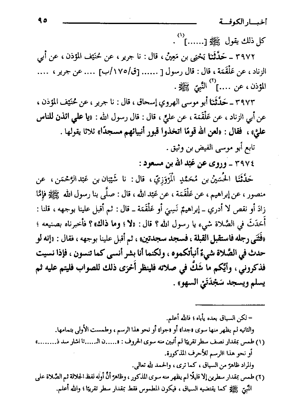 حَدَّثَنَا الحُسَيْن بْنُ مُحَمَّدٍ الْمَرْوَزِيّ، قال: حدثنا شَيْبَان بْنُ عَبْد الرَّحْمَن، عَنْ مَنْصُورٍ، عَنْ إِبْرَاهِيمَ، عَنْ عَلْقَمَة، عَنْ عَبْد اللَّهِ، قَالَ: صلَّى بِنَا رَسُولُ اللَّهِ صَلَّى اللَّهُ عَلَيْهِ وَسَلَّمَ فإِمَّا زادَ أَوْ نَقَصَ لا أَدْرِي - إبراهيمٌ نَسِيَ أَوْ عَلْقَمَة - قَالَ: ثُمَّ أَقْبَلَ عَلَيْنَا بِوَجْهِهِ، قُلْنَا: أَحَدَثَ فِي الصَّلاة شَيْءٌ يَا رَسُولَ اللَّهِ؟ قَالَ: لا؛ وَمَا ذَاكَ"؟ فَأَخْبَرْنَاهُ بِصَنِيعِهِ فَثَنَى رِجْلَهُ فَاسْتَقْبَلَ الْقِبْلَةَ، فَسَجَدَ سَجْدَتَيْنِ، ثُمَّ أَقْبَلَ عَلَيْنَا بِوَجْهِهِ، فَقَالَ: إِنَّهُ لَوْ حَدَثَ فِي الصَّلاة شيءٌ أَنْبَأْتُكُمُوهُ، وَلَكِنَّمَا أَنَا بَشَرٌ أَنْسَى كَمَا تَنْسَوْنَ، فَإِذَا نَسِيتُ فَذَكِّرُونِي، وأيُّكم مَا شَكَّ فِي صَلاتِهِ فَلْيَنْظُرْ أَحْرَى ذَلِكَ لِلصَّوَابِ فَلْيُتِمَّ عَلَيْهِ ثُمَّ يُسَلِّمْ وَيَسْجُدْ سَجْدَتَيْ السَّهْوِ
