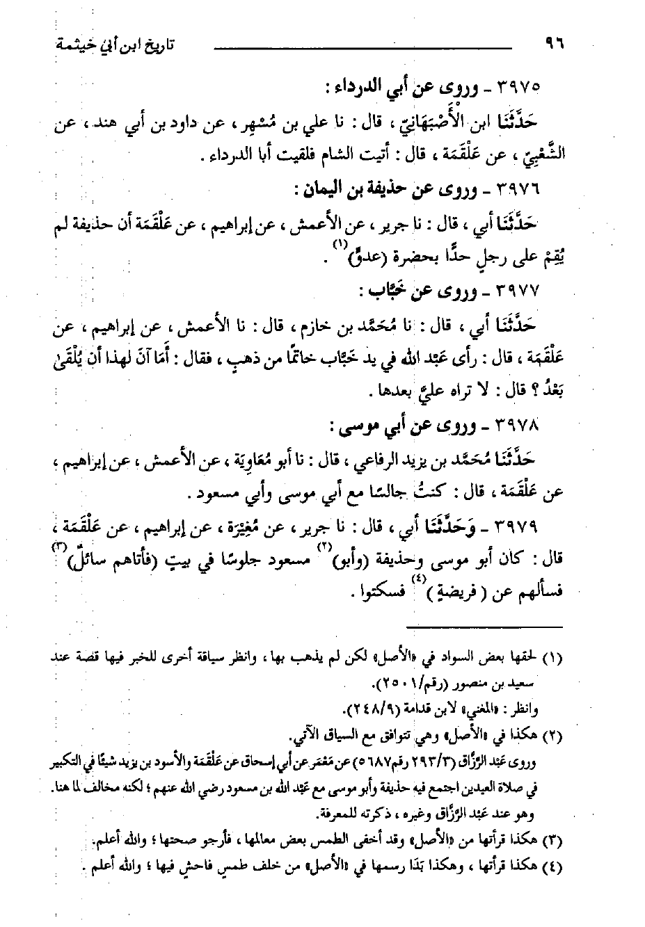 ٣٩٧٩- وَحَدَّثَنَا أَبِي، قَالَ: حَدَّثَنَا جَرِيرٌ، عَنْ مُغِيْرَة، عَنْ إِبْرَاهِيمَ، عَنْ عَلْقَمَة، قَالَ: كَانَ أَبُو مُوسَى وَحُذَيْفَةُ وَأَبُو مَسْعُودٍ جُلُوسًا فِي بيتٍ فأتاهم سائلٌ فسألهم عن ... فَسَكَتُوا