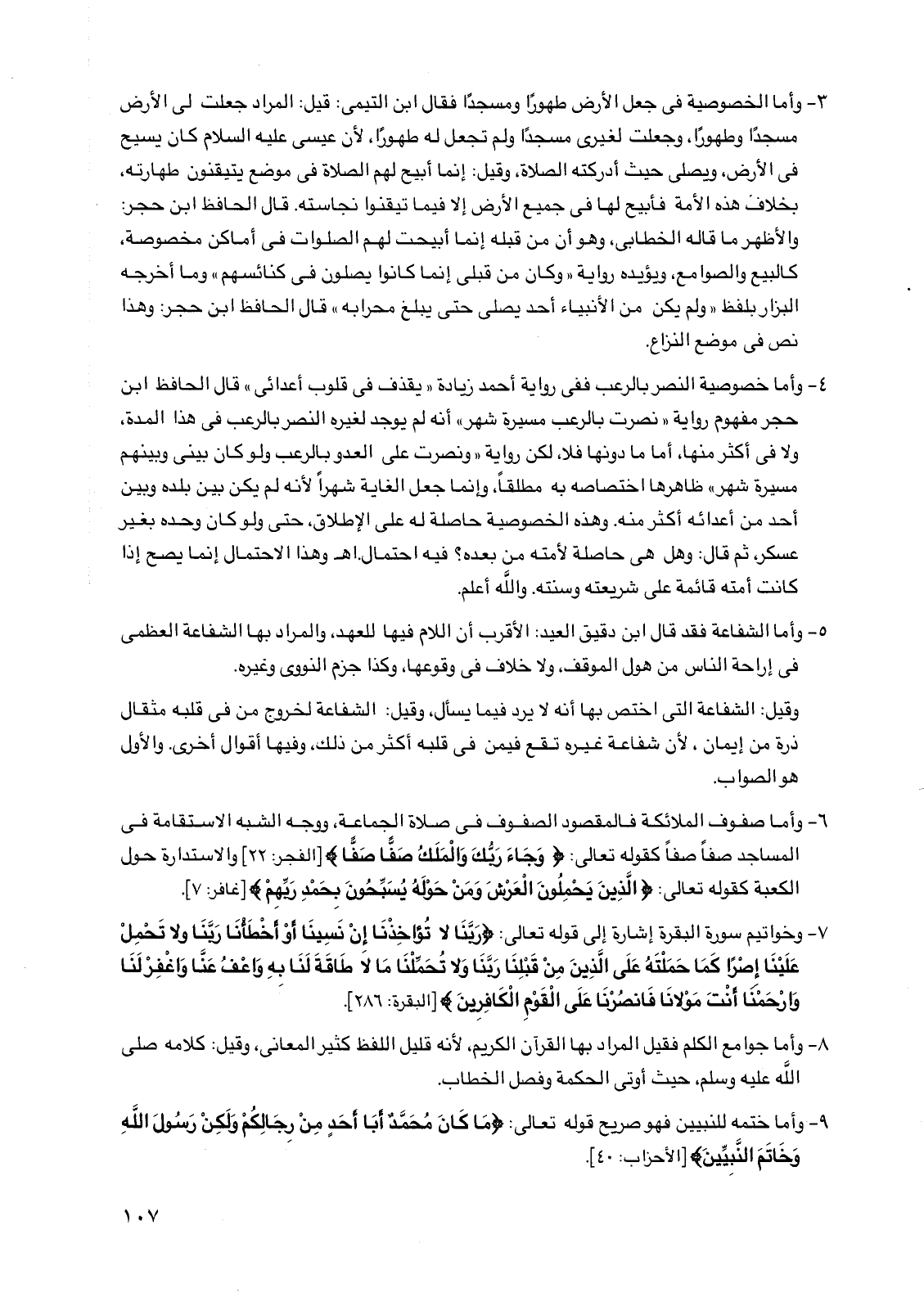4 - وأما خصوصية النصر بالرعب ففي رواية أحمد زيادة "يقذف في قلوب أعدائي" قال الحافظ ابن حجر مفهوم رواية "نصرت بالرعب مسيرة شهر" أنه لم يوجد لغيره النصر بالرعب في هذه المدة، ولا في أكثر منها، أما ما دونها فلا، لكن رواية "ونصرت على العدو بالرعب ولو كان بيني وبينهم مسيرة شهر" ظاهرها اختصاصه به مطلقاً، وإنما جعل الغاية شهراً لأنه لم يكن بين بلده وبين أحد من أعدائه أكثر منه. وهذه الخصوصية حاصلة له على الإطلاق، حتى ولو كان وحده بغير عسكر، ثم قال: وهل هي حاصلة لأمته من بعده؟ فيه احتمال. اهـ وهذا الاحتمال إنما يصح إذا كانت أمته قائمة على شريعته وسنته. والله أعلم.