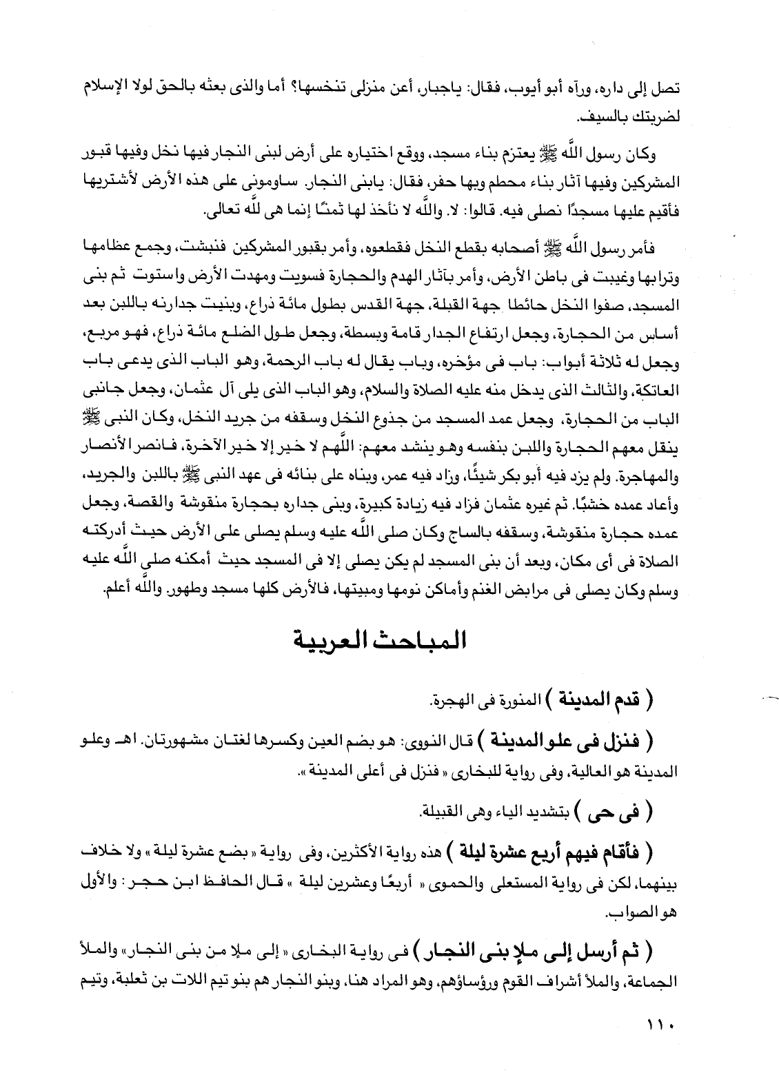 فأمر رسول اللَّه صلى الله عليه وسلم أصحابه بقطع النخل فقطعوه، وأمر بقبور المشركين فنبشت، وجمع عظامها وترابها وغيبت في باطن الأرض، وأمر بآثار الهدم والحجارة فسويت ومهدت الأرض واستوت ثم بنى المسجد، صفوا النخل حائطًا جهة القبلة، جهة القدس بطول مائة ذراع، وبنيت جدرانه باللبن بعد أساس من الحجارة، وجعل ارتفاع الجدار قامة وبسطة، وجعل طول الضلع مائة ذراع، فهو مربع، وجعل له ثلاثة أبواب: باب في مؤخره، وباب يقال له باب الرحمة، وهو الباب الذي يدعى باب العاتكة، والثالث الذي يدخل منه عليه الصلاة والسلام، وهو الباب الذي يلي آل عثمان، وجعل جانبي الباب من الحجارة، وجعل عمد المسجد من جذوع النخل وسقفه من جريد النخل، وكان النبي صلى الله عليه وسلم ينقل معهم الحجارة واللبن بنفسه وهو ينشد معهم: اللَّهم لا خير إلا خير الآخرة، فانصر الأنصار والمهاجرة. ولم يزد فيه أبو بكر شيئًا، وزاد فيه عمر، وبناه على بنائه في عهد النبي صلى الله عليه وسلم باللبن والجريد، وأعاد عمده خشبًا. ثم غيره عثمان فزاد فيه زيادة كبيرة، وبنى جداره بحجارة منقوشة والقصة، وجعل عمده حجارة منقوشة، وسقفه بالساج وكان صلى اللَّه عليه وسلم يصلي على الأرض حيث أدركته الصلاة في أي مكان، وبعد أن بنى المسجد لم يكن يصلي إلا في المسجد حيث أمكنه صلى اللَّه عليه وسلم وكان يصلي في مرابض الغنم وأماكن نومها ومبيتها، فالأرض كلها مسجد وطهور. واللَّه أعلم.