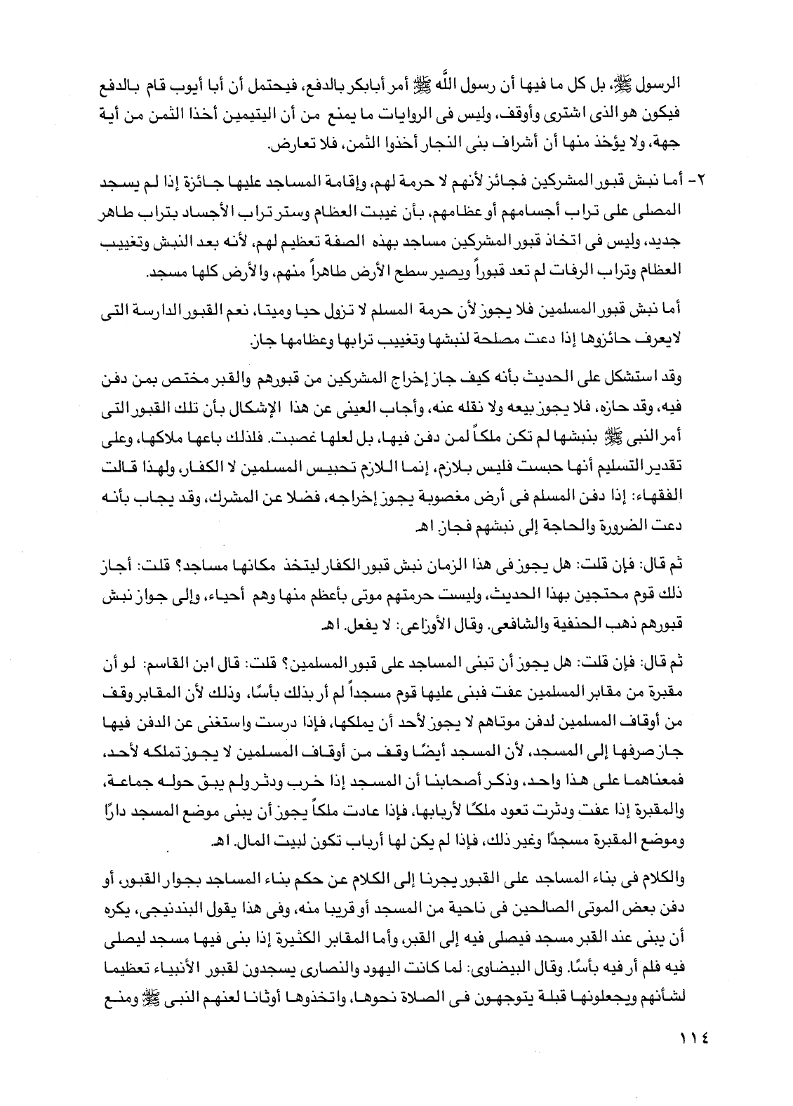 2 - أما نبش قبور المشركين فجائز لأنهم لا حرمة لهم، وإقامة المساجد عليها جائزة إذا لم يسجد المصلي على تراب أجسامهم أو عظامهم، بأن غيبت العظام وستر تراب الأجساد بتراب طاهر جديد، وليس في اتخاذ قبور المشركين مساجد بهذه الصفة تعظيم لهم، لأنه بعد النبش وتغييب العظام وتراب الرفات لم تعد قبورًا ويصير سطح الأرض طاهرًا منهم، والأرض كلها مسجد.