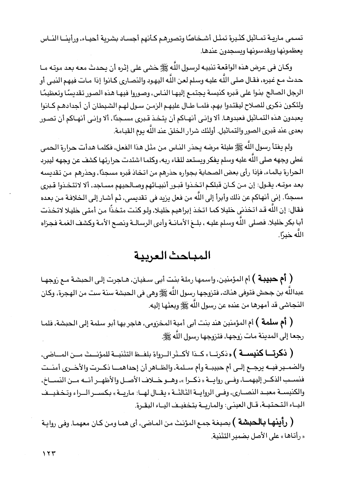 وكان في عرض هذه الواقعة تنبيه لرسول اللَّه صلى الله عليه وسلم خشي على إثره أن يحدث معه بعد موته ما حدث مع غيره، فقال صلى اللَّه عليه وسلم لعن اللَّه اليهود والنصارى كانوا إذا مات فيهم النبي أو الرجل الصالح بنوا على قبره كنيسة يجتمع إليها الناس، وصوروا فيها هذه الصور تقديسًا وتعظيمًا ولتكون ذكرى للصلاح ليقتدوا بهم، فلما طال عليهم الزمن سول لهم الشيطان أن أجدادهم كانوا يعبدون هذه التماثيل فعبدوها. ألا وإني أنهاكم أن يتخذ قبري مسجدًا، ألا وإني أنهاكم أن تصور بعدي عند قبري الصور والتماثيل. أولئك شرار الخلق عند الله يوم القيامة.