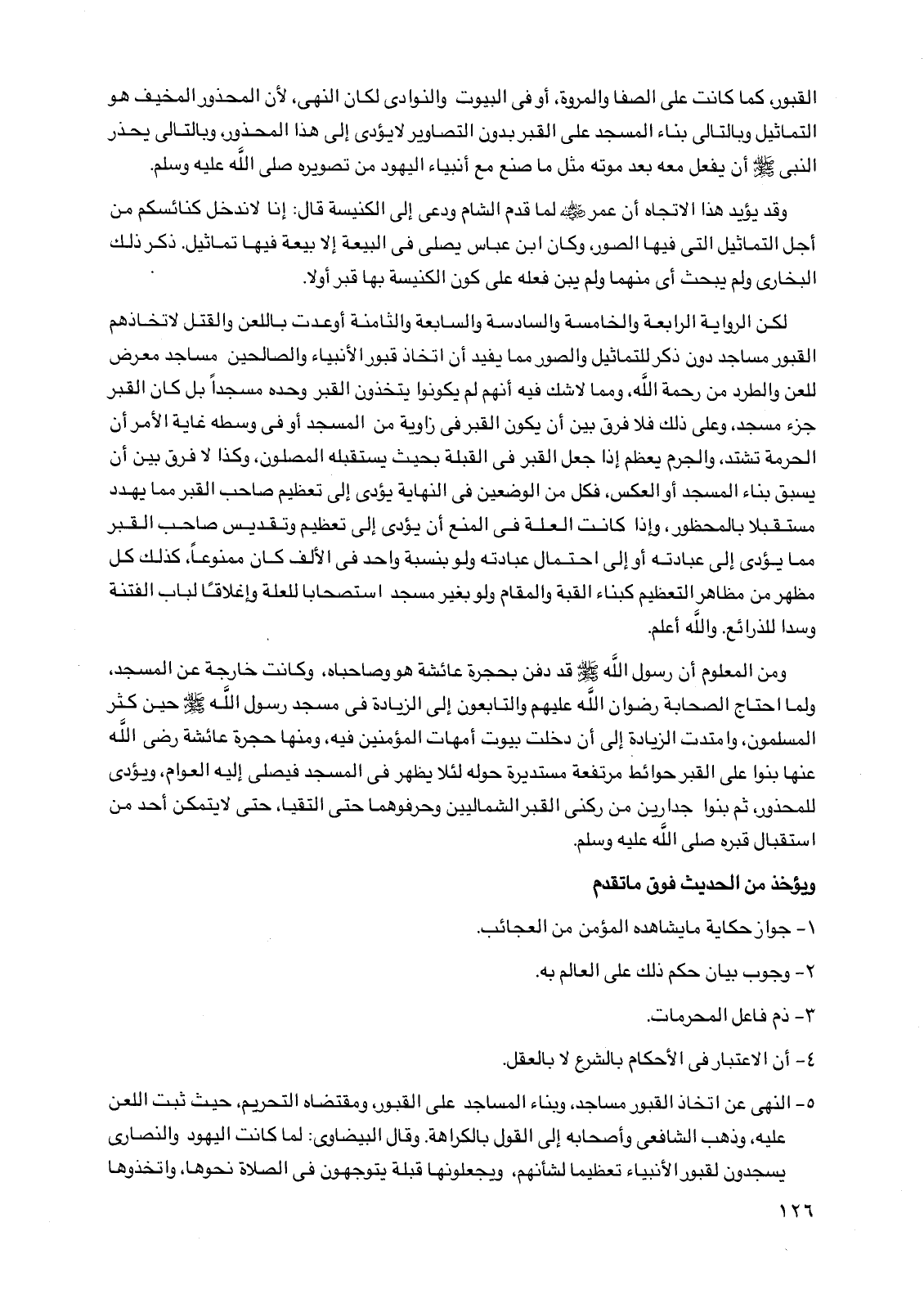 5 - النهي عن اتخاذ القبور مساجد، وبناء المساجد على القبور، ومقتضاه التحريم، حيث ثبت اللعن عليه، وذهب الشافعي وأصحابه إلى القول بالكراهة. وقال البيضاوي: لما كانت اليهود والنصارى يسجدون لقبور الأنبياء تعظيمًا لشأنهم، ويجعلونها قبلة يتوجهون في الصلاة نحوها، واتخذوها