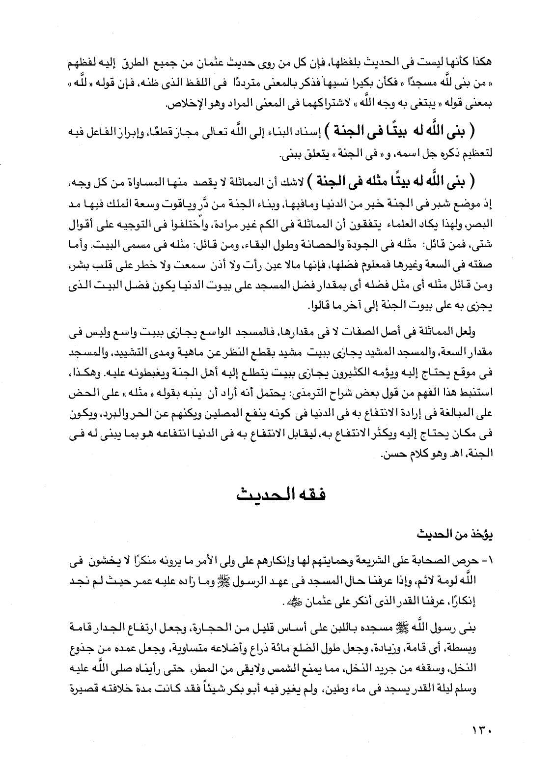 (بنى الله له بيتًا مثله في الجنة) لا شك أن المماثلة لا يقصد منها المساواة من كل وجه، إذ موضع شبر في الجنة خير من الدنيا وما فيها، وبناء الجنة من در وياقوت وسعة الملك فيها مد البصر، ولهذا يكاد العلماء يتفقون أن المماثلة في الكم غير مرادة، واختلفوا في التوجيه على أقوال شتى، فمن قائل: مثله في الجودة والحصانة وطول البقاء، ومن قائل: مثله في مسمى البيت. وأما صفته في السعة وغيرها فمعلوم فضلها، فإنها ما لا عين رأت ولا أذن سمعت ولا خطر على قلب بشر، ومن قائل مثله أي مثل فضله أي بمقدار فضل المسجد على بيوت الدنيا يكون فضل البيت الذي يجزى به على بيوت الجنة إلى آخر ما قالوا.