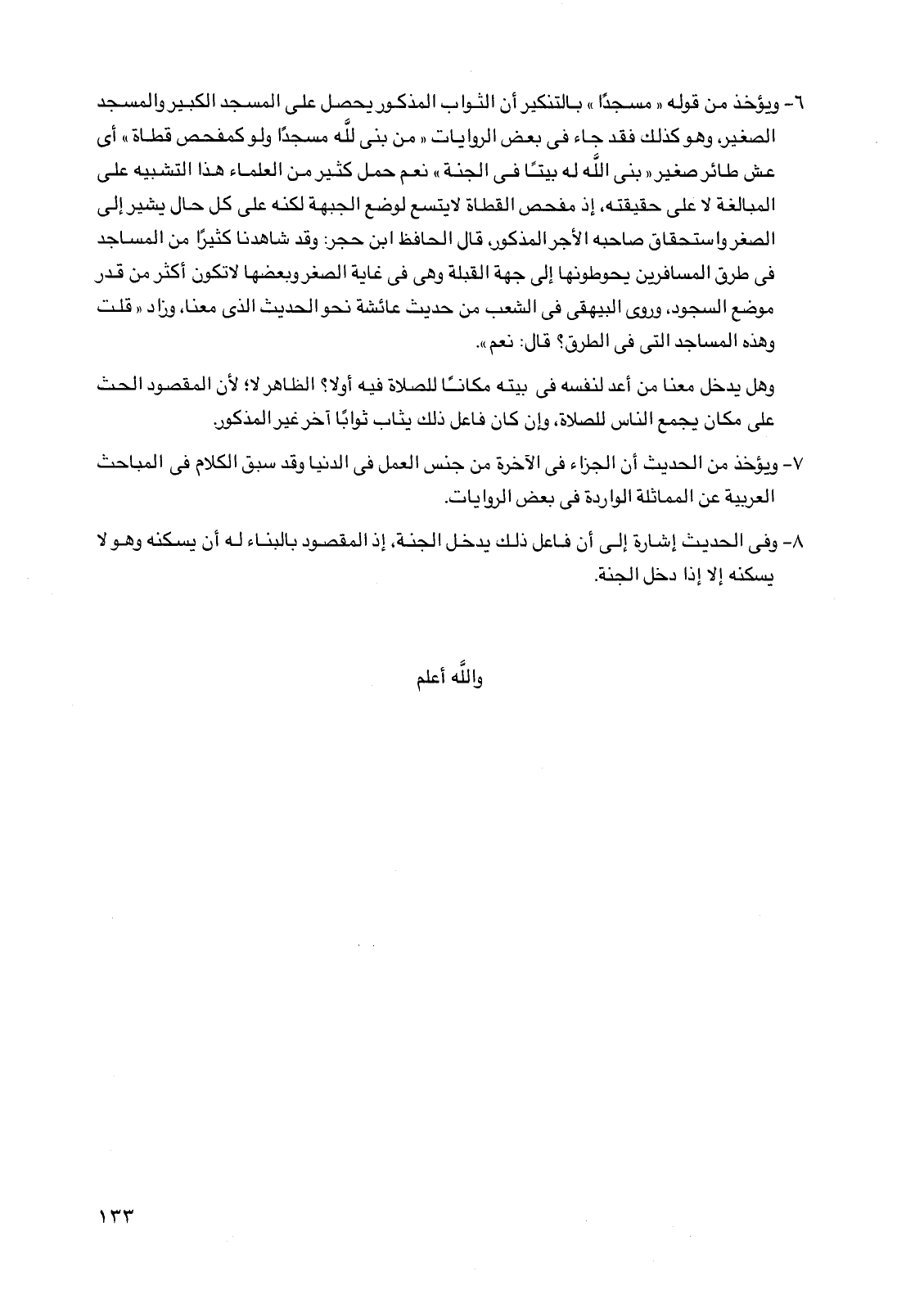 6 - ويؤخذ من قوله "مسجدًا" بالتنكير أن الثواب المذكور يحصل على المسجد الكبير والمسجد الصغير، وهو كذلك فقد جاء في بعض الروايات "من بنى لله مسجدًا ولو كمفحص قطاة" أي عش طائر صغير "بنى الله له بيتًا في الجنة" نعم حمل كثير من العلماء هذا التشبيه على المبالغة لا على حقيقته، إذ مفحص القطاة لا يتسع لوضع الجبهة لكنه على كل حال يشير إلى الصغر واستحقاق صاحبه الأجر المذكور، قال الحافظ ابن حجر: وقد شاهدنا كثيرًا من المساجد في طرق المسافرين يحوطونها إلى جهة القبلة وهي في غاية الصغر وبعضها لا تكون أكثر من قدر موضع السجود، وروى البيهقي في الشعب من حديث عائشة نحو الحديث الذي معنا، وزاد "قلت وهذه المساجد التي في الطرق؟ قال: نعم".