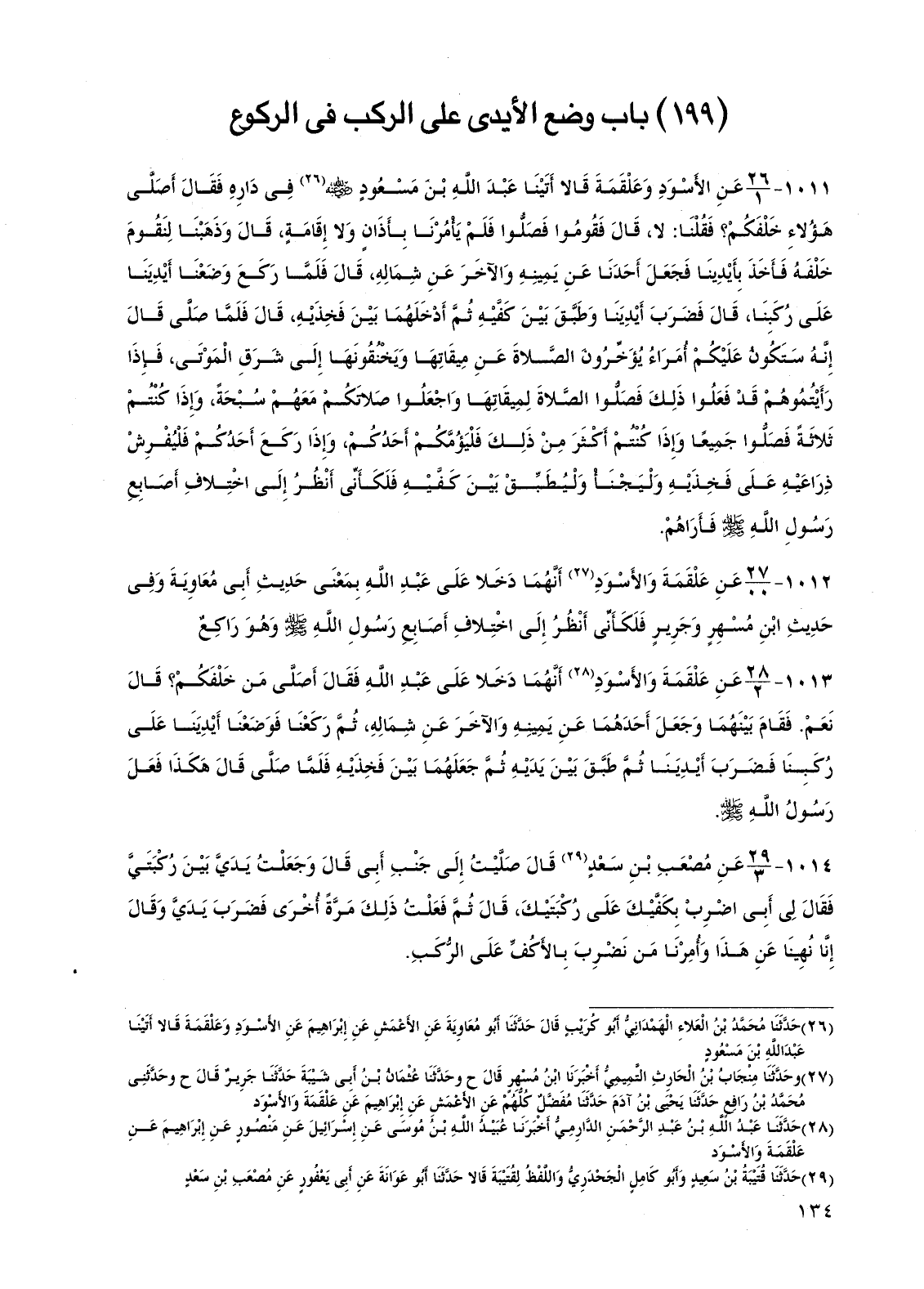 1011 - عن الأسود وعلقمة قالا أتينا عبد الله بن مسعود رضي الله عنه في داره فقال أصلى هؤلاء خلفكم؟ فقلنا: لا، قال فقوموا فصلوا فلم يأمرنا بأذان ولا إقامة، قال وذهبنا لنقوم خلفه فأخذ بأيدينا فجعل أحدنا عن يمينه والآخر عن شماله، قال فلما ركع وضعنا أيدينا على ركبنا، قال فضرب أيدينا وطبق بين كفيه ثم أدخلهما بين فخذيه، قال فلما صلى قال إنه ستكون عليكم أمراء يؤخرون الصلاة عن ميقاتها ويخنقونها إلى شرق الموتى، فإذا رأيتموهم قد فعلوا ذلك فصلوا الصلاة لميقاتها واجعلوا صلاتكم معهم سبحة، وإذا كنتم ثلاثة فصلوا جميعًا وإذا كنتم أكثر من ذلك فليؤمكم أحدكم، وإذا ركع أحدكم فليفرش ذراعيه على فخذيه وليجنأ وليطبق بين كفيه فلكأني أنظر إلى اختلاف أصابع رسول الله صلى الله عليه وسلم فأراهم.
