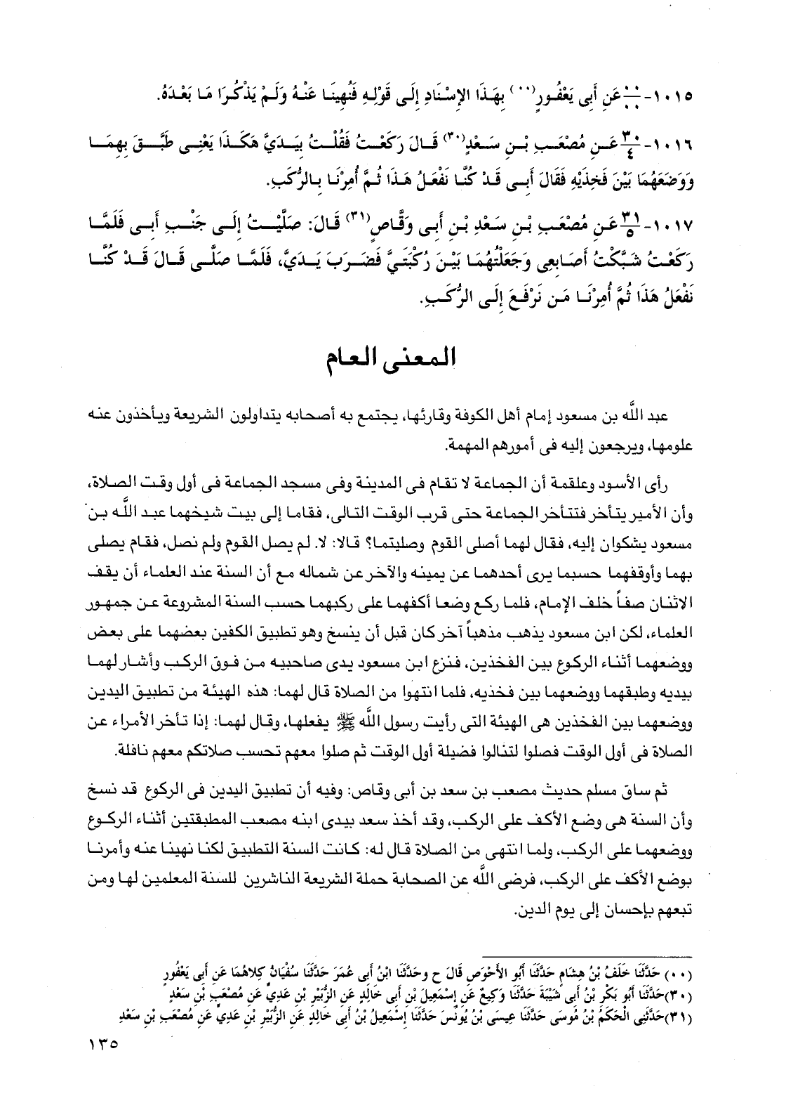 ثم ساق مسلم حديث مصعب بن سعد بن أبي وقاص: وفيه أن تطبيق اليدين في الركوع قد نسخ وأن السنة هي وضع الأكف على الركب، وقد أخذ سعد بيدي ابنه مصعب المطبقتين أثناء الركوع ووضعهما على الركب، ولما انتهى من الصلاة قال له: كانت السنة التطبيق لكنا نهينا عنه وأمرنا بوضع الأكف على الركب، فرضي الله عن الصحابة حملة الشريعة الناشرين للسنة المعلمين لها ومن تبعهم بإحسان إلى يوم الدين.