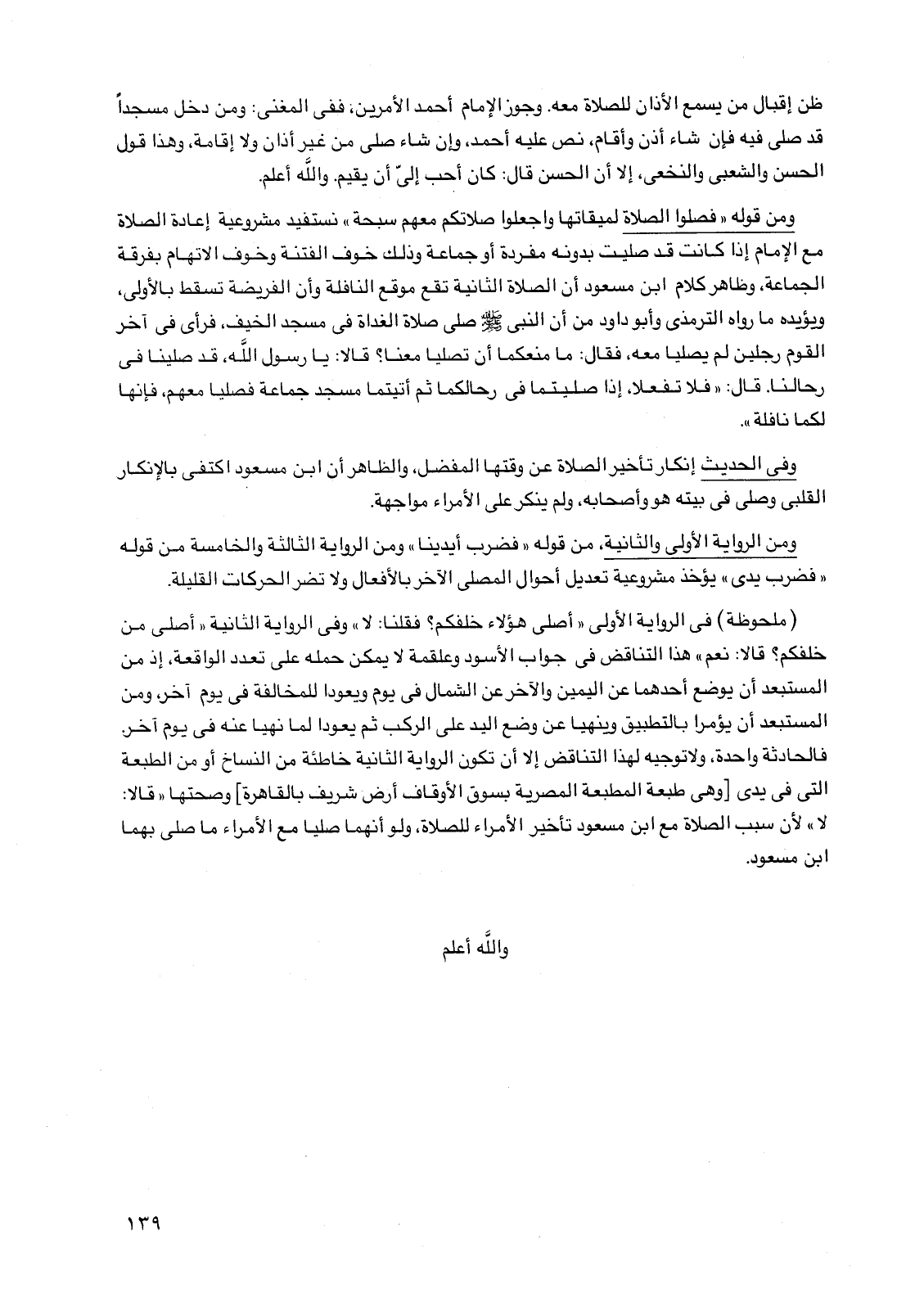 (ملحوظة) في الرواية الأولى "أصلى هؤلاء خلفكم؟ فقلنا: لا" وفي الرواية الثانية "أصلي من خلفكم؟ قالا: نعم" هذا التناقض في جواب الأسود وعلقمة لا يمكن حمله على تعدد الواقعة، إذ من المستبعد أن يوضع أحدهما عن اليمين والآخر عن الشمال في يوم ويعودا للمخالفة في يوم آخر، ومن المستبعد أن يؤمرا بالتطبيق وينهيا عن وضع اليد على الركب ثم يعودا لما نهيا عنه في يوم آخر. فالحادثة واحدة، ولا توجيه لهذا التناقض إلا أن تكون الرواية الثانية خاطئة من النساخ أو من الطبعة التي في يدي [وهي طبعة المطبعة المصرية بسوق الأوقاف أرض شريف بالقاهرة] وصحتها "قالا: لا" لأن سبب الصلاة مع ابن مسعود تأخير الأمراء للصلاة، ولو أنهما صليا مع الأمراء ما صلى بهما ابن مسعود.