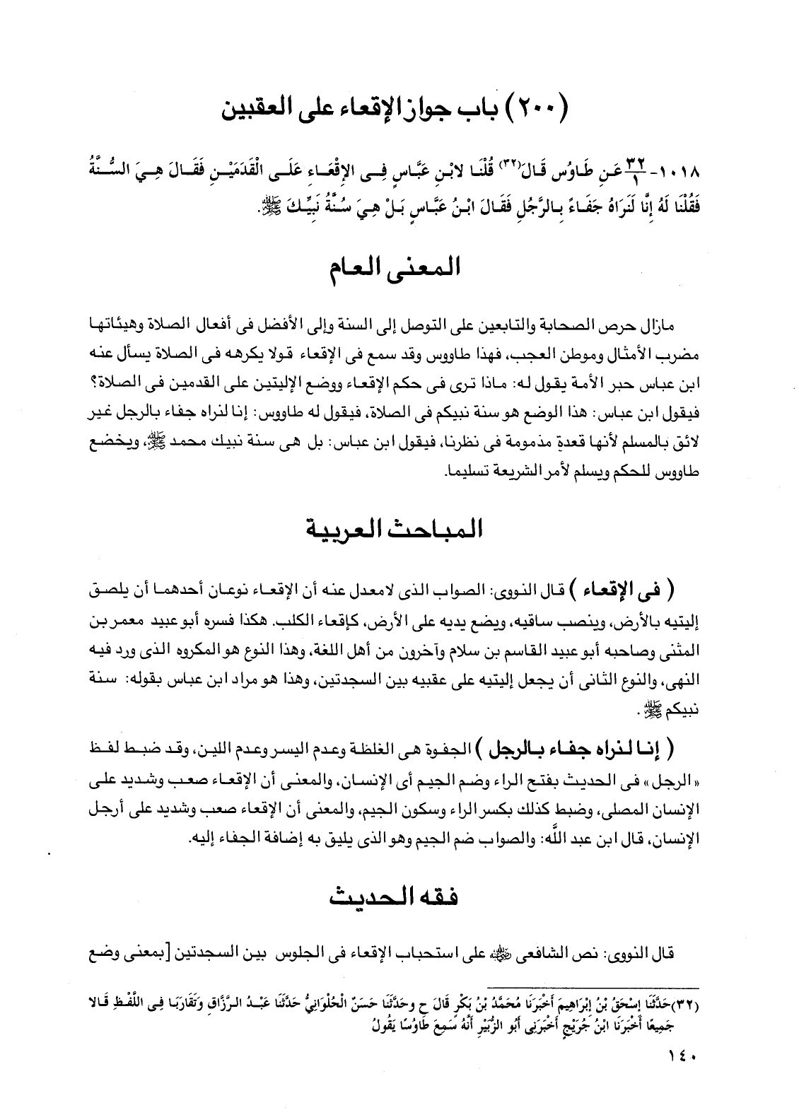 (في الإقعاء) قال النووي: الصواب الذي لا معدل عنه أن الإقعاء نوعان أحدهما أن يلصق إليتيه بالأرض، وينصب ساقيه، ويضع يديه على الأرض، كإقعاء الكلب. هكذا فسره أبو عبيد معمر بن المثنى وصاحبه أبو عبيد القاسم بن سلام وآخرون من أهل اللغة، وهذا النوع هو المكروه الذي ورد فيه النهي، والنوع الثاني أن يجعل إليتيه على عقبيه بين السجدتين، وهذا هو مراد ابن عباس بقوله: سنة نبيكم صلى الله عليه وسلم.