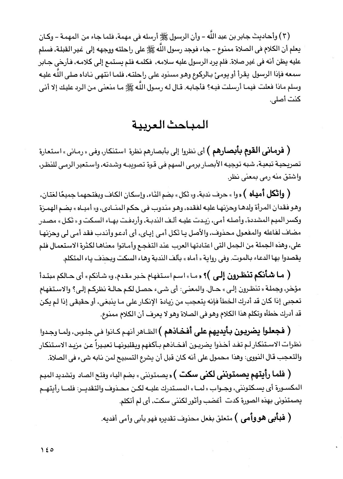 (3) وأحاديث جابر بن عبد الله - وأن الرسول صلى الله عليه وسلم أرسله في مهمة، فلما جاء من المهمة - وكان يعلم أن الكلام في الصلاة ممنوع - جاء فوجد رسول الله صلى الله عليه وسلم على راحلته ووجهه إلى غير القبلة، فسلم عليه يظن أنه في غير صلاة. فلم يرد الرسول عليه سلامه، فكلمه فلم يستمع إلى كلامه، فأرخى جابر سمعه فإذا الرسول يقرأ أو يومئ بالركوع وهو مسنود على راحلته، فلما انتهى ناداه صلى الله عليه وسلم ماذا فعلت فيما أرسلت فيه؟ فأجابه. قال له رسول الله صلى الله عليه وسلم ما منعني من الرد عليك إلا أني كنت أصلي.