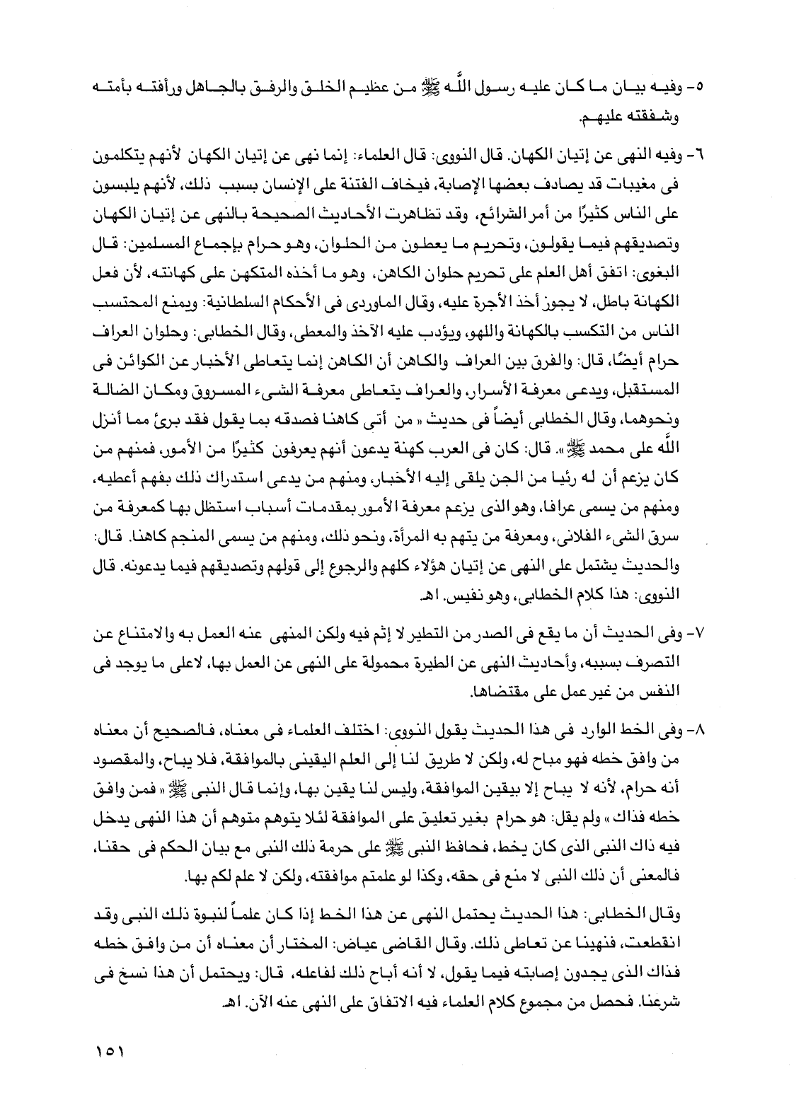 8 - وفي الخط الوارد في هذا الحديث يقول النووي: اختلف العلماء في معناه، فالصحيح أن معناه من وافق خطه فهو مباح له، ولكن لا طريق لنا إلى العلم اليقيني بالموافقة، فلا يباح، والمقصود أنه حرام، لأنه لا يباح إلا بيقين الموافقة، وليس لنا يقين بها، وإنما قال النبي صلى الله عليه وسلم "فمن وافق خطه فذاك". ولم يقل: هو حرام بغير تعليق على الموافقة لئلا يتوهم متوهم أن هذا النهي يدخل فيه ذاك النبي الذي كان يخط، فحافظ النبي صلى الله عليه وسلم على حرمة ذلك النبي مع بيان الحكم في حقنا، فالمعنى أن ذلك النبي لا منع في حقه، وكذا لو علمتم موافقته، ولكن لا علم لكم بها.