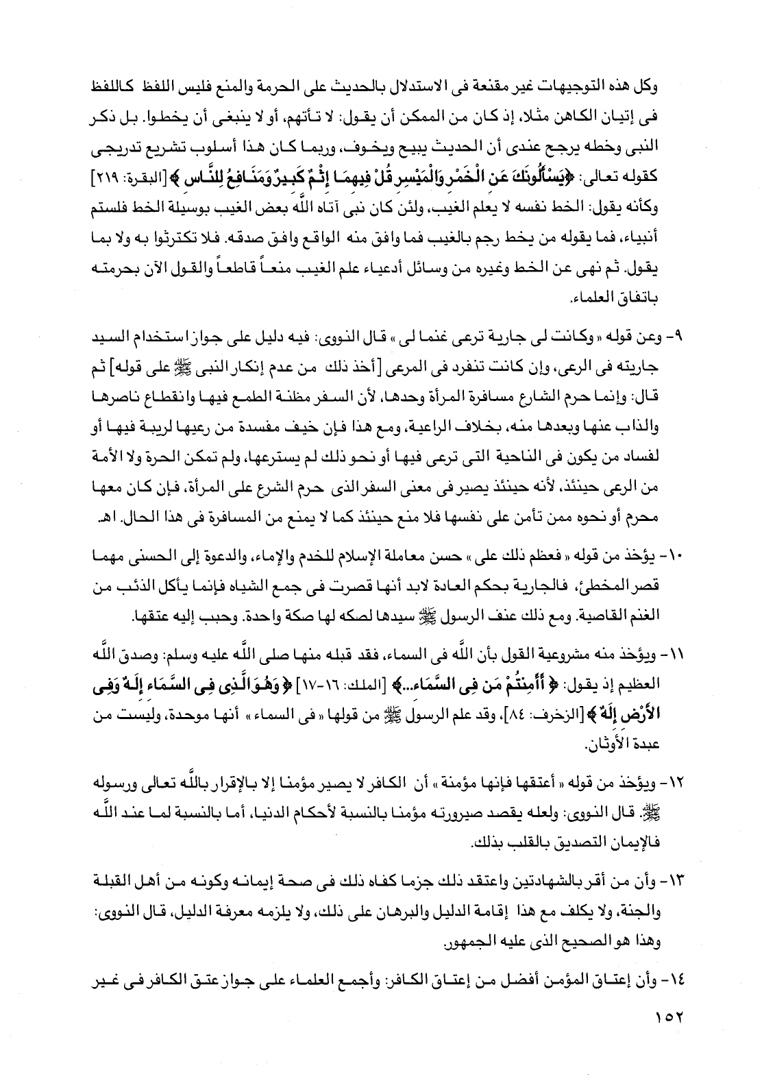 12 - ويؤخذ من قوله "أعتقها فإنها مؤمنة" أن الكافر لا يصير مؤمنًا إلا بالإقرار بالله تعالى ورسوله صلى الله عليه وسلم. قال النووي: ولعله يقصد صيرورته مؤمنًا بالنسبة لأحكام الدنيا، أما بالنسبة لما عند الله فالإيمان التصديق بالقلب بذلك.