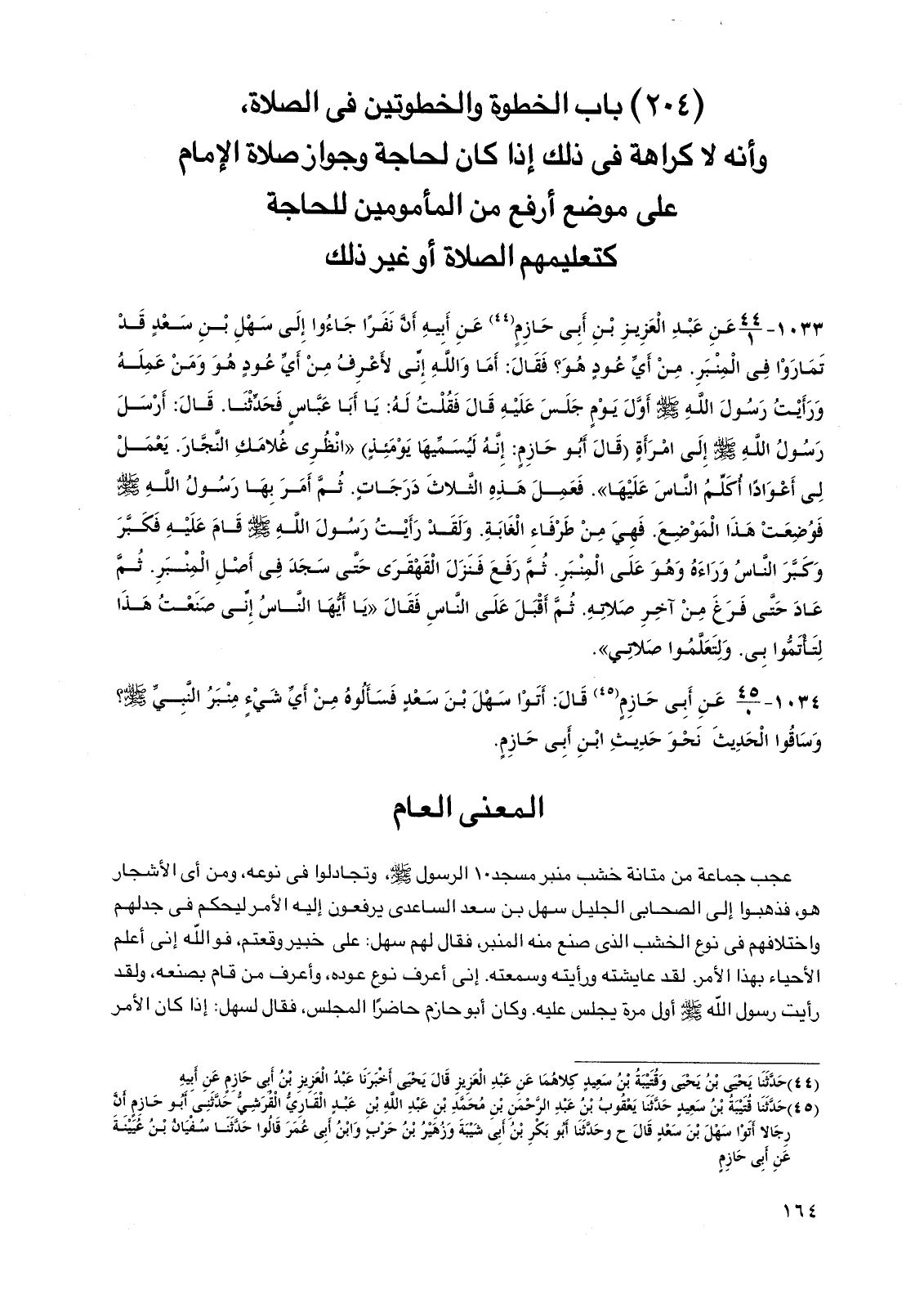 (204) باب الخطوة والخطوتين في الصلاة، وأنه لا كراهة في ذلك إذا كان لحاجة وجواز صلاة الإمام على موضع أرفع من المأمومين للحاجة كتعليمهم الصلاة أو غير ذلك