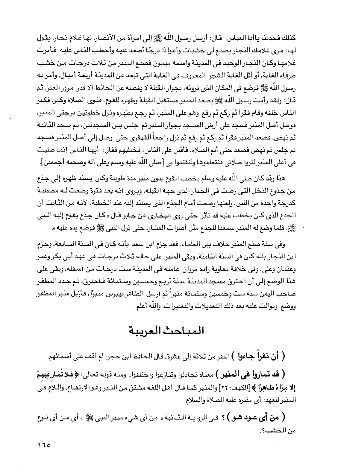 كذلك، فحدثنا يا أبا العباس. قال: أرسل رسول الله صلى الله عليه وسلم إلى امرأة من الأنصار. لها غلام نجار. يقول لها: مري غلامك النجار يصنع لي خشبات وأعوادًا درجًا أصعد عليه وأخطب الناس عليه. فأمرت غلامها وكان النجار الوحيد في المدينة واسمه ميمون فصنع المنبر من ثلاث درجات من خشب طرفاء الغابة، أو أثل الغابة الشجر المعروف في الغابة التي تبعد عن المدينة أربعة أميال، وأمر به رسول الله صلى الله عليه وسلم فوضع في المكان الذي ترونه، بجوار القبلة لا يفصله عن الحائط إلا قدر مرور العنز. ثم قال: ولقد رأيت رسول الله صلى الله عليه وسلم يصعد المنبر مستقبل القبلة وظهره للقوم، فنوى الصلاة وكبر، فكبر الناس خلفه وقام فقرأ ثم ركع ثم رفع وهو على المنبر، ثم رجع بظهره ونزل خطوتين درجتي المنبر، فوصل أصل المنبر فسجد على أرض المسجد بجوار المنبر ثم جلس بين السجدتين، ثم سجد الثانية ثم نهض، فصعد المنبر فقرأ ثم ركع ثم رفع ثم نزل راجعًا القهقرى حتى وصل إلى أصل المنبر فسجد ثم جلس ثم نهض فصعد حتى أتم الصلاة، فأقبل على الناس، فخطبهم فقال: أيها الناس إنما صليت في أعلى المنبر لتروا صلاتي فتتعلموها ولتقتدوا بي [صلى الله عليه وسلم وعلى آله وصحبه أجمعين].