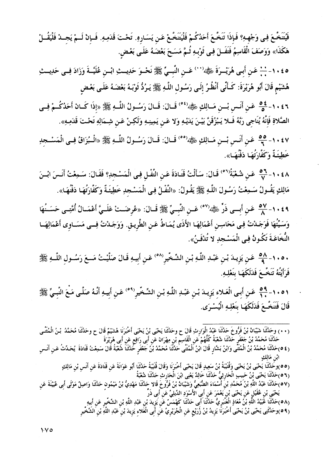 1051 - عن أبي العلاء يزيد بن عبد الله بن الشخير عن أبيه أنه صلى مع النبي صلى الله عليه وسلم قال فتنخع فدلكها بنعله اليسرى.