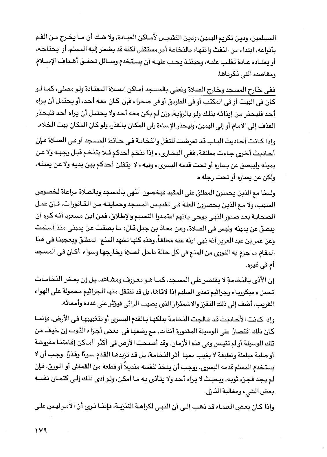 المسلمين، ودين تكريم اليمين، ودين التقديس لأماكن العبادة، ولا شك أن ما يخرج من الفم بأنواعه، ابتداء من النفث وانتهاء بالنخاعة أمر مستقذر، لكنه قد يضطر إليه المسلم، أو يحتاجه، أو يعتاده عادة تغلب عليه، وحينئذ يجب عليه أن يستخدم وسائل تحقق أهداف الإسلام ومقاصده التي ذكرناها.